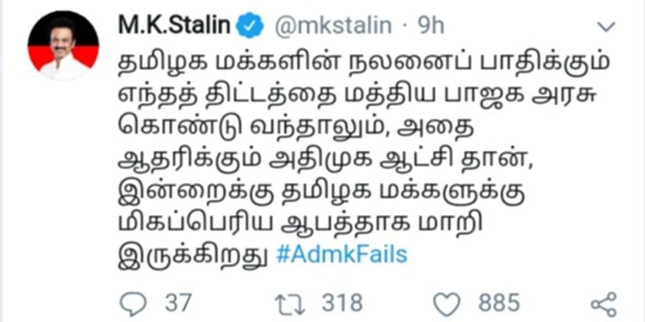 தமிழக மக்களின் நலனைப் பாதிக்கும் எந்தத் திட்டத்தை மத்திய பா.ஜ.க. அரசு கொண்டு வந்தாலும், அதை ஆதரிக்கும் அ.தி.மு.க ஆட்சி தான், இன்றைக்கு தமிழக மக்களுக்கு மிகப்பெரிய ஆபத்தாக மாறி இருக்கிறது என ஸ்டாலின் தனது கண்டனத்தைப் பதிவு செய்துள்ளார்.