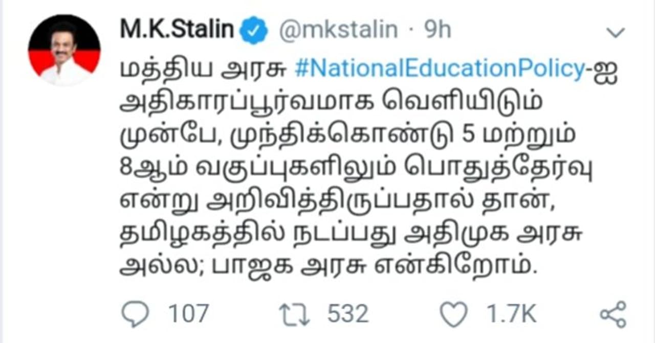 இது குறித்து தனது டுவிட்டர் பக்கத்தில், மத்திய அரசு தேசிய கல்வி கொள்கையை அதிகாரப்பூர்வமாக வெளியிடும் முன்பே, முந்திக்கொண்டு 5 மற்றும் 8-ம் வகுப்புகளிலும் பொதுத்தேர்வு என்று அறிவித்திருப்பதால் தான், தமிழகத்தில் நடப்பது அ.தி.மு.க அரசு அல்ல; பா.ஜ.க அரசு என்கிறோம் என குறிப்பிட்டுள்ளார்.