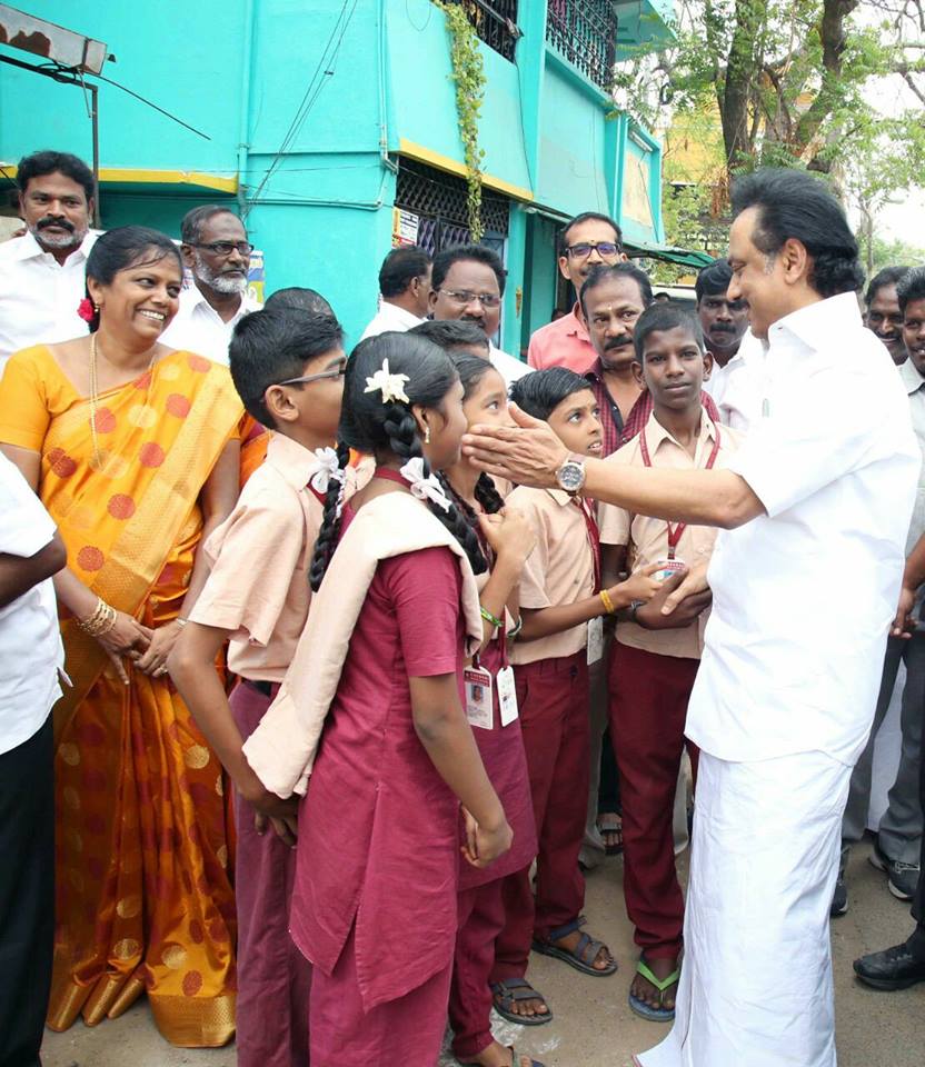 கொளத்தூரில் மரங்களை நட்ட ஸ்டாலின் பின்னர் அங்குள்ள பள்ளிகளில் குழந்தைகளுடன் உரையாடினார். அவர்களுடன் மகிழ்ச்சியாக தனது பொழுதை கழித்தார். மாணவ மாணவியர் அவருடன் கைகுலுக்கினர். அப்போது மாணவ மாணவியர் வைத்த கோரிக்கையை கேட்டுக்கொண்டார். அதை நிறைவேற்றுவதாக கூறினார்.