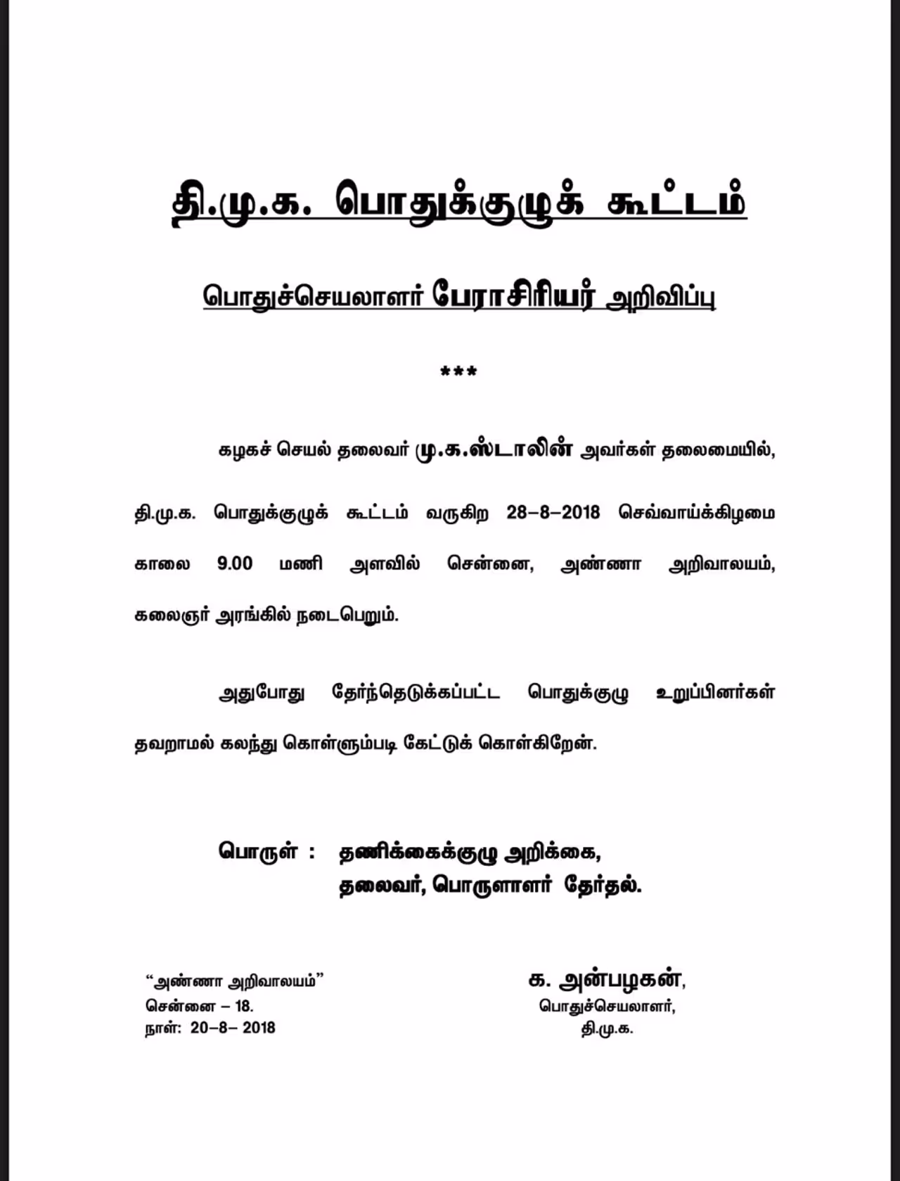 இந்நிலையில் திமுக பொதுச் செயலாளர் இன்று வெளியிட்டுள்ள அறிவிப்பில் அக்கட்சியின் செயல் தலைவர் மு.க.ஸ்டாலின் தலைமையில் திமுக பொதுக் குழுக் கூட்டம் வரும் 28 ஆம் தேதி செவ்வாய்கிழமை காலை 9 மணிக்கு சென்னை அண்ணா அறிவாலயத்தில் நடைபெறும் என தெரிவித்துள்ளார்.