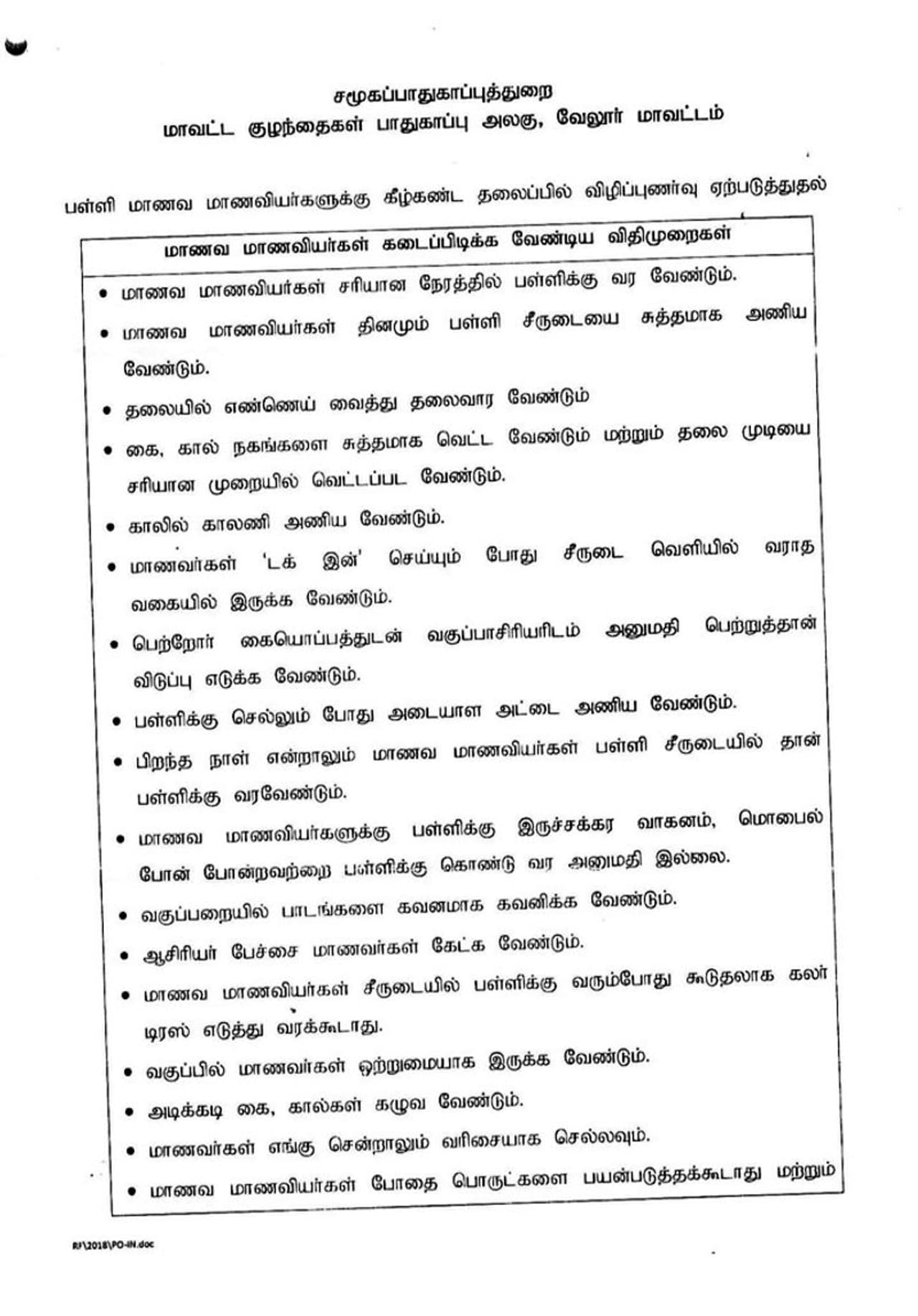 இது தொடர்பாக வேலூர் மாவட்ட சமூக பாதுகாப்புத்துறை, மாவட்ட குழந்தைகள் பாதுகாப்புத்துறை வெளியிட்டுள்ள கட்டுப்பாடுகள் விவரம் பின்வருமாறு:- மாணவ மாணவியர் சரியான நேரத்திற்கு பள்ளிக்கு வர வேண்டும், மாணவ மாணவியர் தினமும் பள்ளி சீருடையை சுத்தமாக அணிய வேண்டாம், தலையில் எண்ணெய் வைத்து தலைவார வேண்டும், கை கால் நகங்களை சுத்தமாக வெட்ட வேண்டும் மற்றும் தலைமுடியை சரியான முறையில் வெட்டப்பட வேண்டும். ஒவ்வொருவரும் காலணி அணிந்திருக்க வேண்டும், மாணவர்கள் டக்கின் செய்யும்போது சீருடை வெளியில் வராத வகையில் இருக்க வேண்டும்.