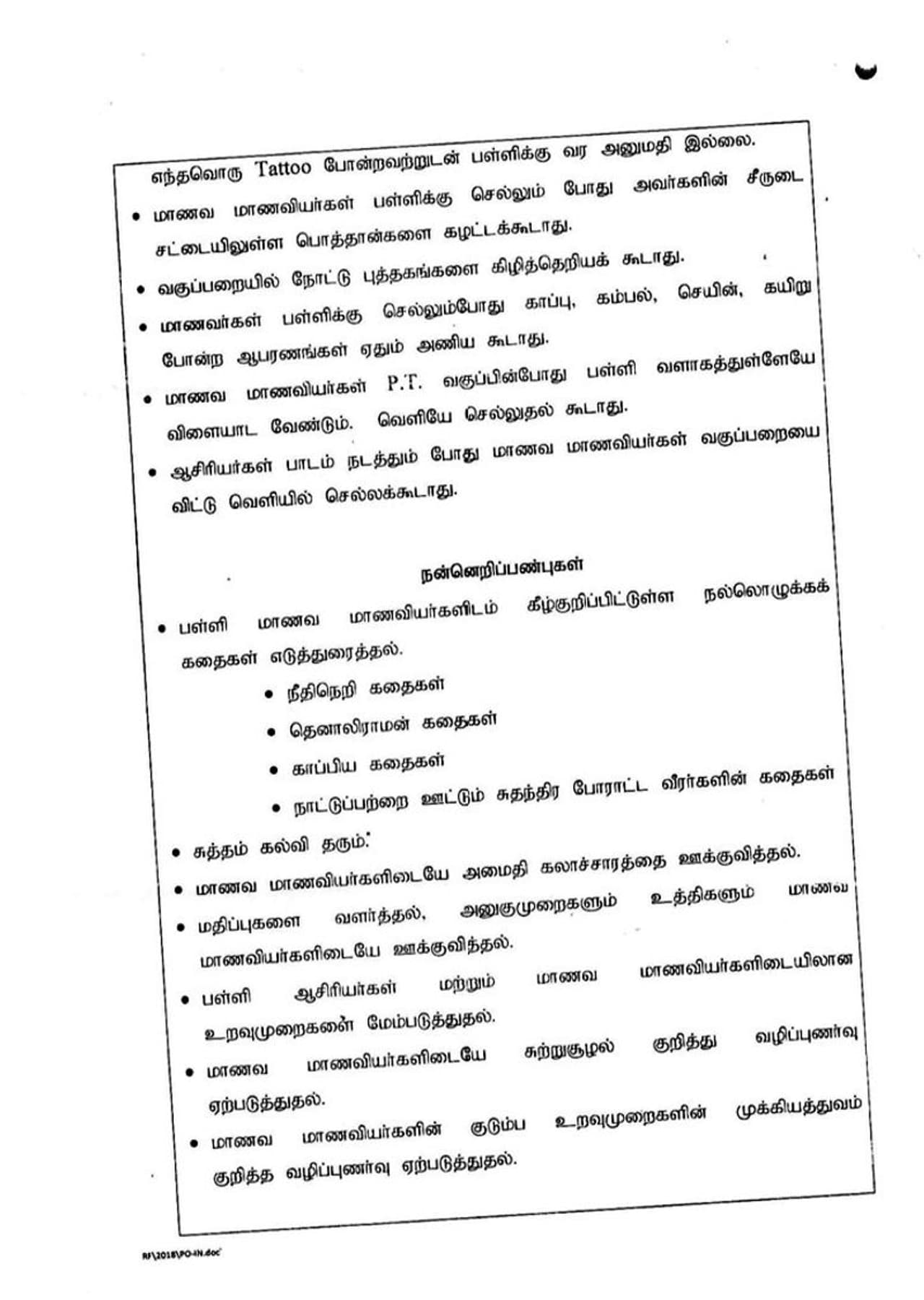 பள்ளிக்கூட மாணவர்கள் காப்பு, கம்மல், செயின், கயிறு கட்ட தடைவிதித்து சமூகப் பாதுகாப்புத் துறை கட்டுப்பாடு விதித்துள்ளது. பிறந்த நாளன்றும் கூட சீருடையில்தான் வரவேண்டும், டூவீலர், பள்ளிக் கூடங்களில் மொபைல் போனுக்கு அனுமதி இல்லை, டாட்டூ வுடன் பள்ளிக்கூடம் வர அனுமதி இல்லை என்றும் உத்தரவு பிறப்பிக்கப்பட்டுள்ளது.