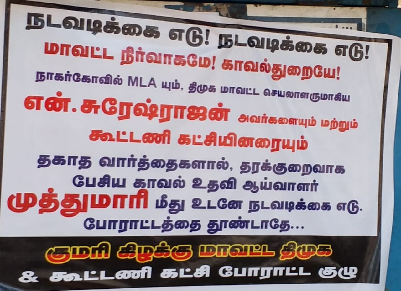 முன்னாள் அமைச்சர் ஒருவரை நட்டநடு சாலையில், பச்சை பச்சையாக கெட்ட வார்த்தையில் சத்தம் போட்டு திட்டிக் கொண்டு எஸ்.ஐ. முத்துமாரி சென்றது அப்பகுதியில் பரபரப்பை ஏற்பட்டது. எஸ்.ஐ.யின் இந்த பேச்சால் அதிர்ச்சியடைந்த திமுகவினர், முத்துமாரியை பதவி நீக்கம் செய்ய வேண்டும் என்றும், அவர் மீது துறை ரீதியாக நடவடிக்கை வேண்டும் என்று வலியுறுத்தி நாகர்கோவில் நகர் முழுவதும் போஸ்டர்கள் அடித்து ஒட்டியுள்ளனர்.