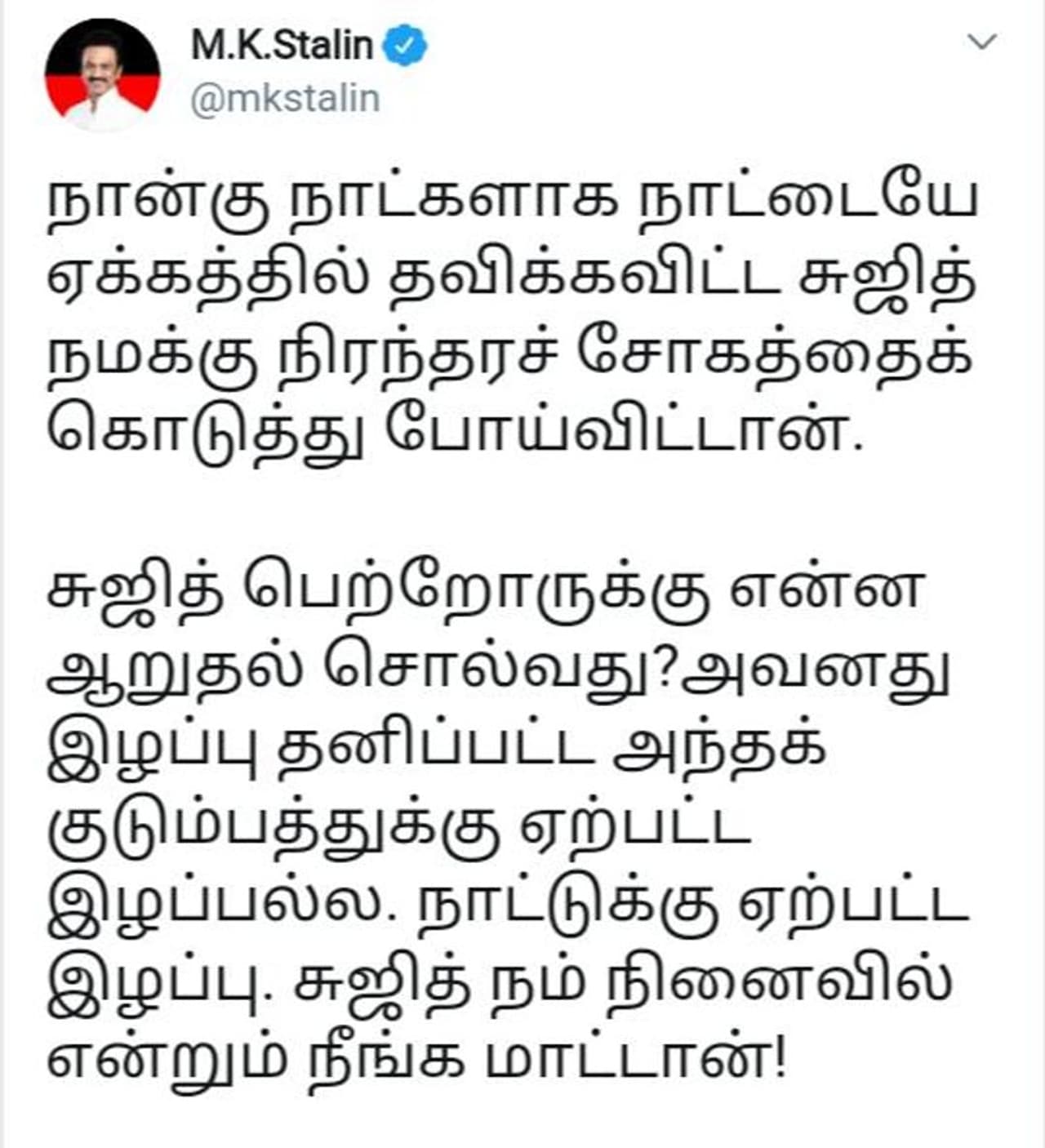 இது குறித்து மு.க ஸ்டாலின் தனது டுவிட்டரில் கூறியிருப்பதாவது:- “ நான்கு நாட்களாக நாட்டையே ஏக்கத்தில் தவிக்கவிட்ட சுஜித் நமக்கு நிரந்தரச் சோகத்தைக் கொடுத்து போய்விட்டான்.