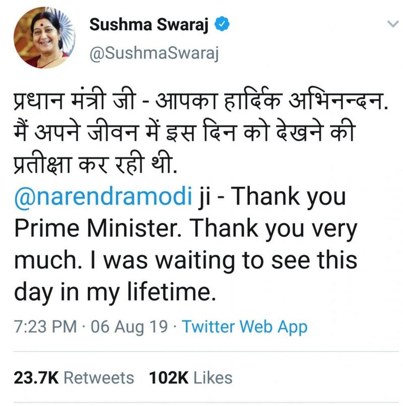 இந்நிலையில் ஜம்மு - காஷ்மீர் மாநிலத்திற்கு, அளிக்கப்பட்டிருந்த , சிறப்பு அந்தஸ்துகளுக்கான, அரசியல் அமைப்புச் சட்டத்தின், 370 மற்றும் 35 - ஏ பிரிவுகள் நீக்கப்பட்டது குறித்து சுஷ்மா தனது டுவிட்டர் பக்கத்தில் 'என் வாழ்நாளில் இந்த நாளை தான் காண காத்திருந்தேன். பிரதமர் மோடிக்கு எனது நன்றி என தனது கடைசி கருத்தினை பதிவேற்றினார்.