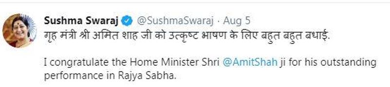 இதே போல் காஷ்மீர் பிரச்சனையை மிகச் சிறப்பாக கையாண்ட மத்திய உள்துறை அமைச்சர் அமித்ஷாவுக்கும் சுஷ்மா நன்றி தெரிவித்திருந்தார்.