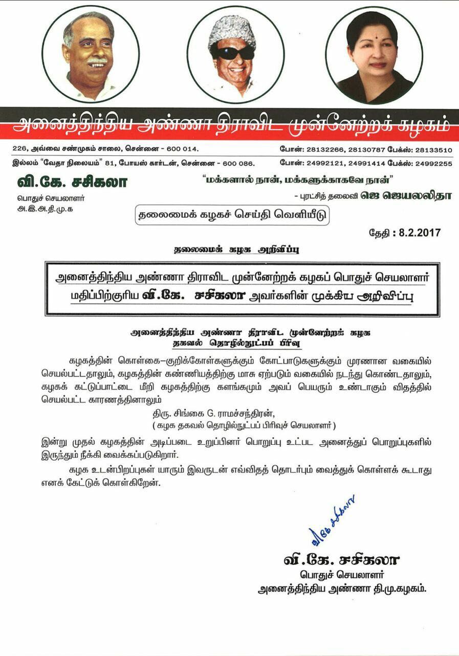 கழகத்தின் கண்ணியத்திற்கு மாசு விளைவிக்கும் வகையில் நடந்து கொண்டதாலும் சிங்கை ஜி.ராமச்சந்திரனை அடிப்படை உறுப்பினர் பொறுப்பிலிருந்து நீக்குவதாக உத்தரவிட்டுள்ளார்.