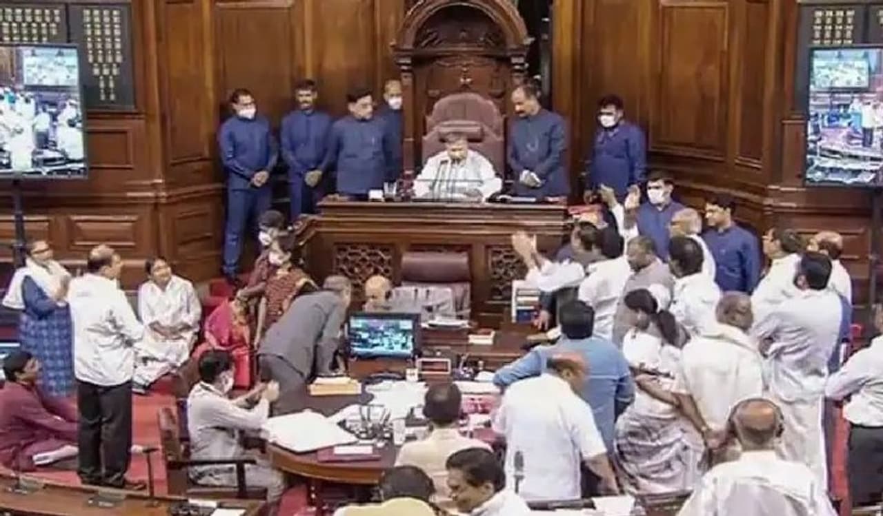 இதேபோல் மாநிலங்களவையில் தொடர் அமளியில் ஈடுபட்டு மாநிலங்களவையை முடக்கியதால் 19 எம்.பி.க்கள் சஸ்பெண்ட் செய்யப்பட்டுள்ளனர். அவை நடவடிக்கைகளுக்கு இடையூறு ஏற்படுத்தியதாக என்.ஆர்.இளங்கோ, சண்முகம், கிரிராஜன், எம்.எம்.அப்துல்லா, கனிமொழி சோமு, சுஷ்மிதா தேவ், டோலாசென், உள்ளிட்ட 19 எம்.பி.க்கள் மீது விதி எண் 256ன் கீழ் நடவடிக்கை எடுக்கப்பட்டு சஸ்பெண்ட் செய்யப்பட்டுள்ளனர். சஸ்பெண்ட் செய்யப்பட்ட எம்பிக்கள் இந்த வாரம் முழுவதும் மாநிலங்களவையில் பங்கேற்க தடை விதிக்கப்பட்டுள்ளது. இதனை தொடர்ந்து மாநிலங்களவை தலைவரின் இருக்கைக்கு அருகே தரையில் அமர்ந்து திமுக எம்.பி.க்கள் உட்பட 19 பேர் தர்ணாவில் ஈடுபட்டனர். இடைநீக்கம் செய்யப்பட்ட எம்.பி.க்கள் தர்ணாவில் ஈடுபட்ட நிலையில் மாநிலங்களவை நாள் முழுவதும் ஒத்திவைக்கப்பட்டது.