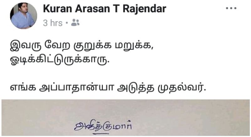 நடிகர் அஜீத் குமாரை அரசியலுக்கு அழைப்பு விடுத்து தன் கைப்பட எழுதிய கடிதத்தை இயக்குநர் சுசீந்திரன் போட்ட ட்விட்டர் பதிவு சினிமா வட்டாரத்திலும் ட்விட்டரிலும் பரபரப்பை ஏற்படுத்தியது. இந்நிலையில், சுசீந்திரனின் கடிதத்தை தன் முக நூல் பக்கத்தில் பதிந்துள்ள இயக்குநரும் லட்சிய திமுக நிறுவன தலைவரின் மகனுமான குறளரசன், “இவரு வேற குறுக்க மறுக்க ஓடிக்கிட்டுருக்காரு. எங்க அப்பாதான்யா அடுத்த முதல்வர்” என்று கமெண்ட்டும் கொடுத்திருக்கிறார்.