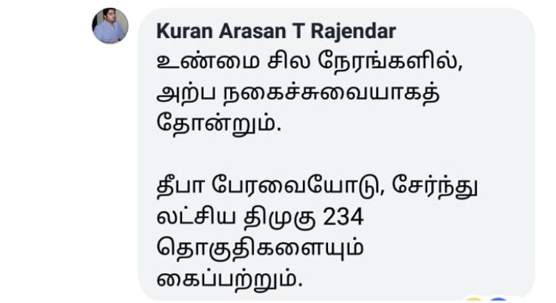 நவாஷ் பின் மீரான் என்பவர், “காமெடி பண்ணாத ப்ரோ” என்று போட்ட கமெண்டுக்கு, “உணமை சில நேரங்களில் அற்ப நகைச்சுவையாகத் தோன்றும். தீபா பேரவையோடு சேர்ந்து லட்சிய திமுக 234 தொகுதிகளையும் கைப்பற்றும்” என்று சீரியஸாகவே பதில் கூறியிருக்கிறார் குறள்.
