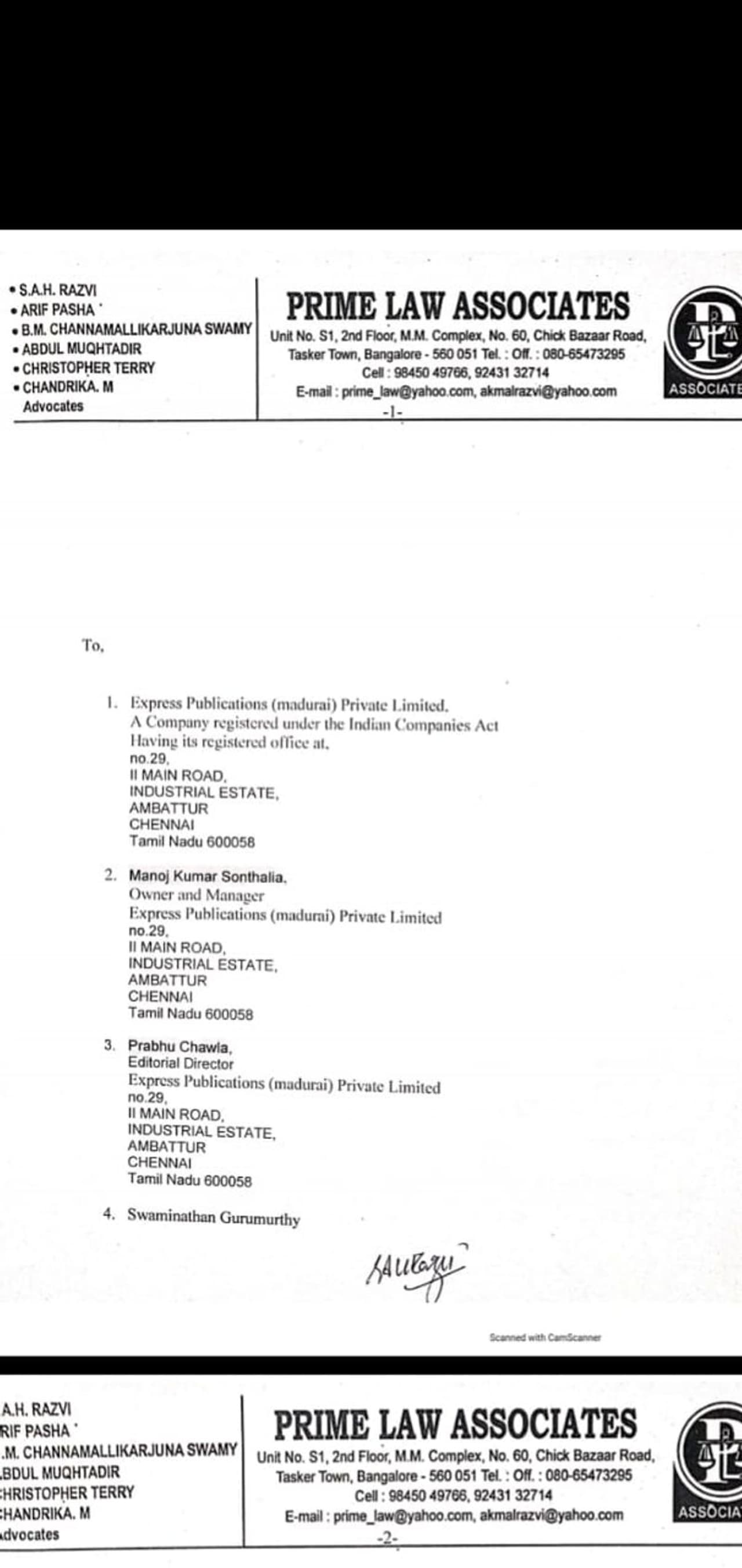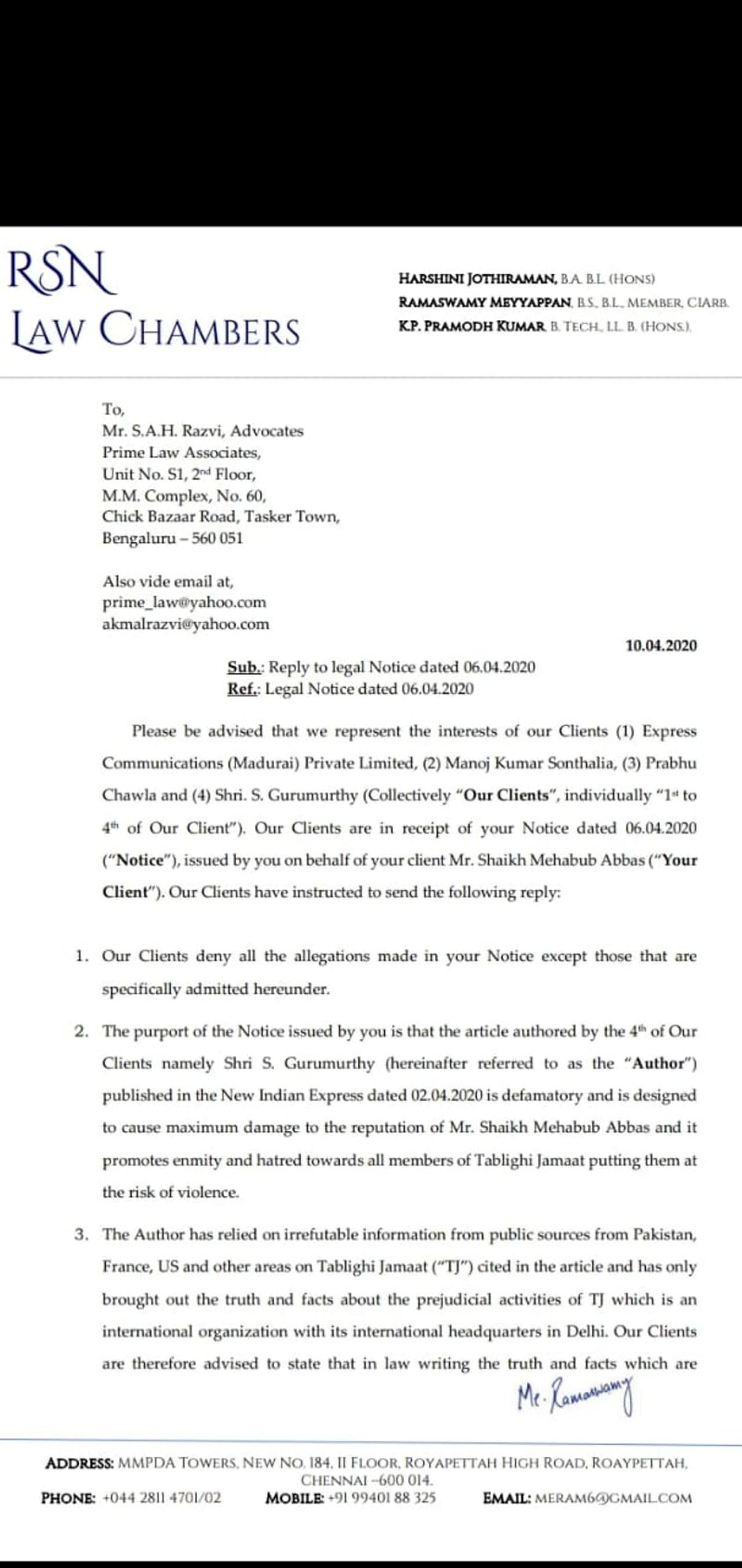 இதற்கு மறுப்புத் தெரிவித்து தங்களது அமைப்பை அவதூறாக சித்தரிப்பதாகவும், பகிரங்க மன்னிப்பு கேட்டு மறுப்புக் கட்டுரை வெளியிடக்கோரியும், நஷ்ட ஈடாக ரூ.1 கோடி தர வேண்டும் எனக் கோரியும், இந்தியன் எக்ஸ்பிரஸ் நிர்வாகத்திற்கும், துக்ளக் குருமூர்த்திக்கும் வக்கீல் நோட்டீஸ் அனுப்பி இருந்தது தப்லிஹி ஜமாத்.. அதற்கு பதிலடி கொடுத்துள்ள குருமூர்த்தி வழக்கறிஞர் தரப்பு, தப்லிஹி ஜமாத் அமைப்பின் பெயரை சொல்லி ஷேக் மெஹபூப் அப்பாஸ் மற்றும் சிலர் வன்முறையில் ஈடுபடுவதாக மட்டுமே கூறியிருந்தார்.