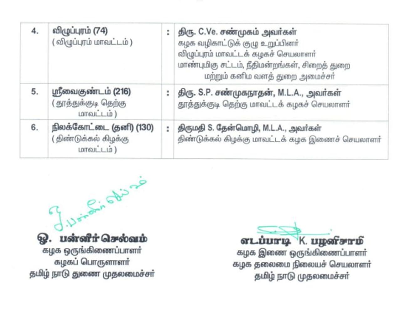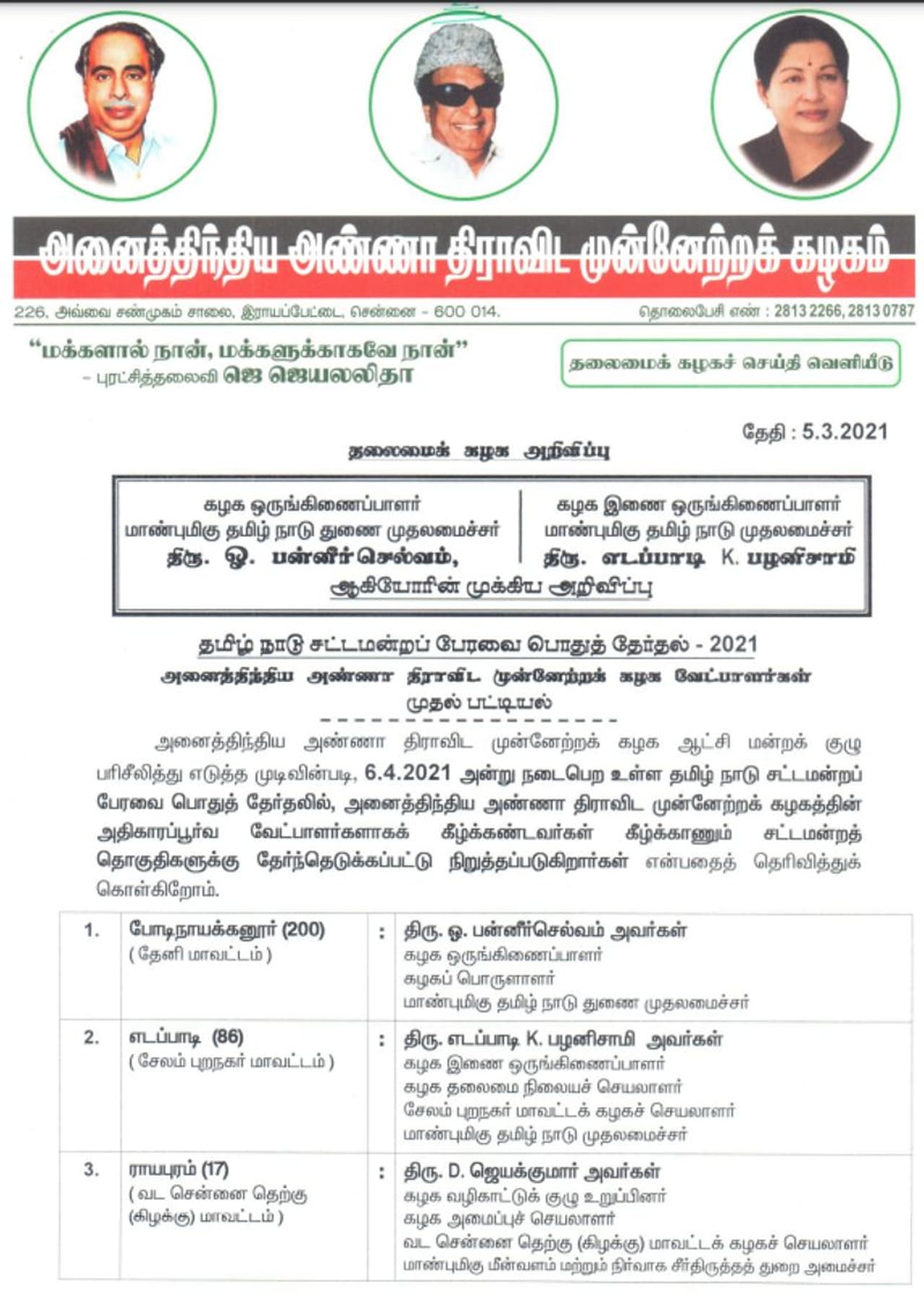 இந்நிலையில், இன்று சுபமுகூர்த்த நாள் என்பதால் முதற்கட்டமாக அதிமுக வேட்பாளர் பட்டியல் வெளியாகியுள்ளது.அதில் போடிநாயக்கனுர் - ஓபிஎஸ், எடப்பாடி - எடப்பாடி பழனிசாமி, விழுப்புரம் - சி.வி.சண்முகம், ராயபுரம் - ஜெயக்குமார், ஸ்ரீவைகுண்டம் - எஸ்.பி.சண்முகநாதன், நிலக்கோட்டை - தேன்மொழி என பட்டியல் வெளியாகியுள்ளது.