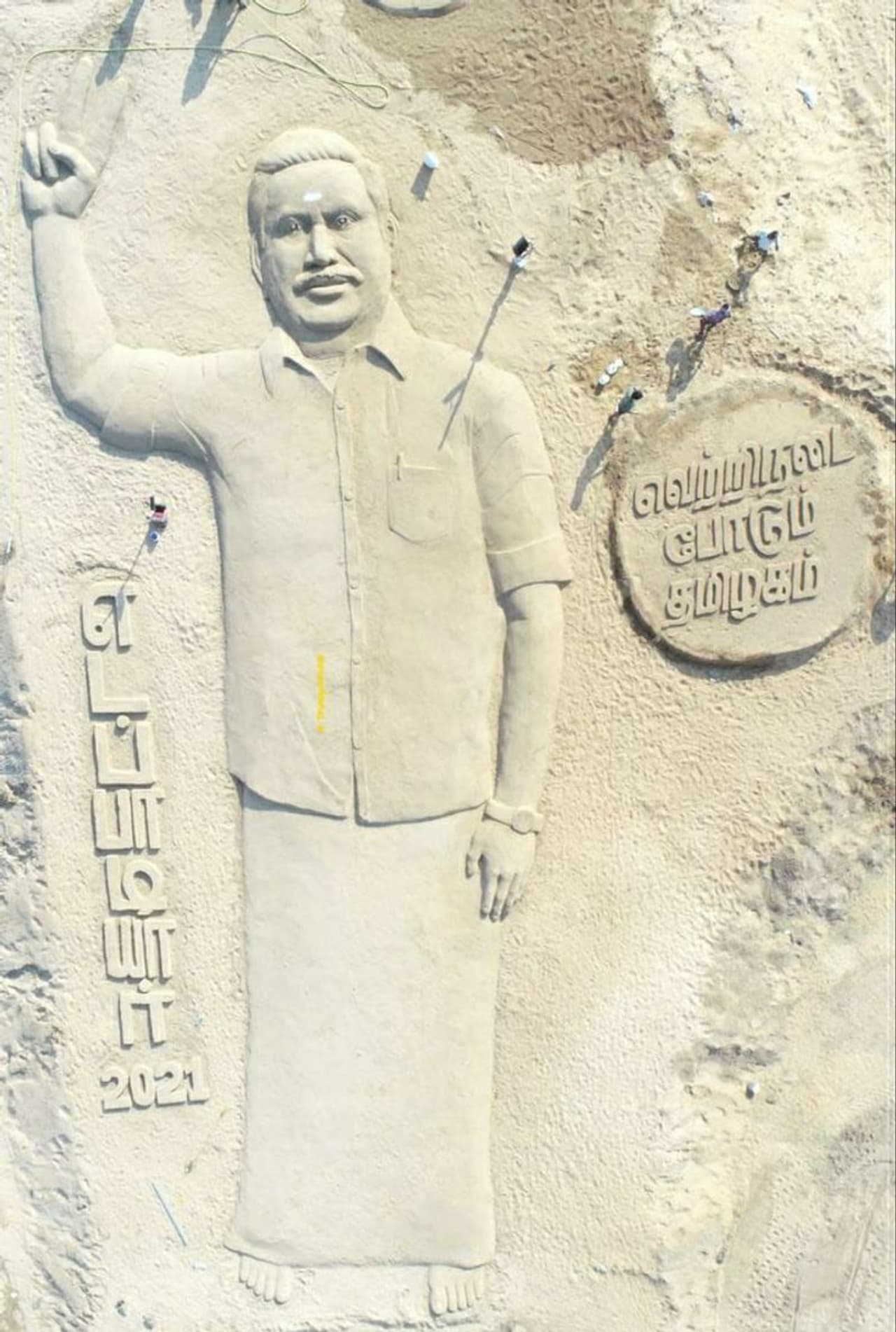 எடப்பாடி 2021 என்ற கோஷத்தை முன்வைத்து இந்த மணல் சிற்பம் பிரமாண்டமான முறையில் வடிவமைக்கப்பட்டுள்ளது.