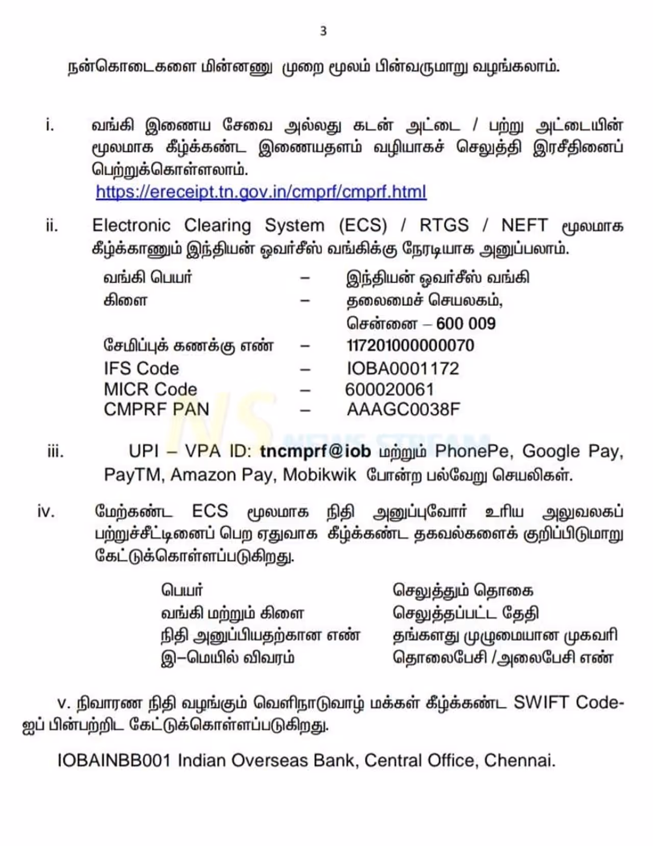 முதல்வர் பொது நிவாரண நிதிக்கு இந்திய ஓவர்சீஸ் வங்கி கணக்கு எண் - 117201000000070, IFSC - IOBA0001172 என்ற வங்கிக்கணக்கில் நிதியை செலுத்தலாம்.