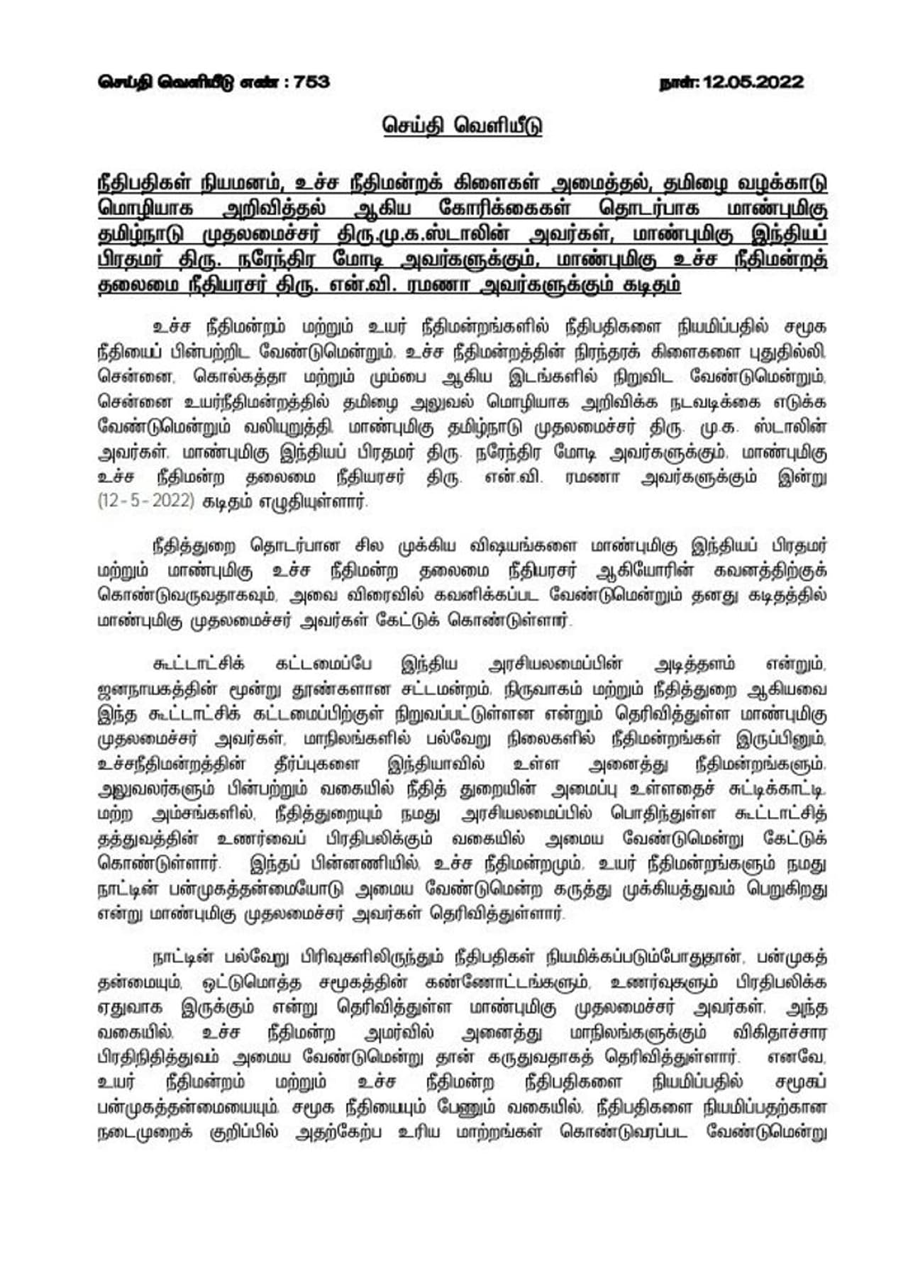 நீதிபதிகள் நியமனம், உச்ச நீதிமன்றக் கிளைகள் அமைத்தல், தமிழை வழக்காடு மொழியாக அறிவித்தல் ஆகிய கோரிக்கைகள் தொடர்பாக முதலமைச்சர் மு.க.ஸ்டாலின், பிரதமர் மற்றும் உச்ச நீதிமன்றத் தலைமை நீதிபதிக்கு கடிதம் எழுதியுள்ளார். மேலும் புதுதில்லி, சென்னை, கொல்கத்தா மற்றும் மும்பை ஆகிய இடங்களில் உச்ச நீதிமன்றத்தின் நிரந்தரக் கிளைகளை அமைப்பதற்குத் தேவையான நடவடிக்கைகளை எடுக்க வேண்டும் என்றும் கோரிக்கை வைத்துள்ளார்.
