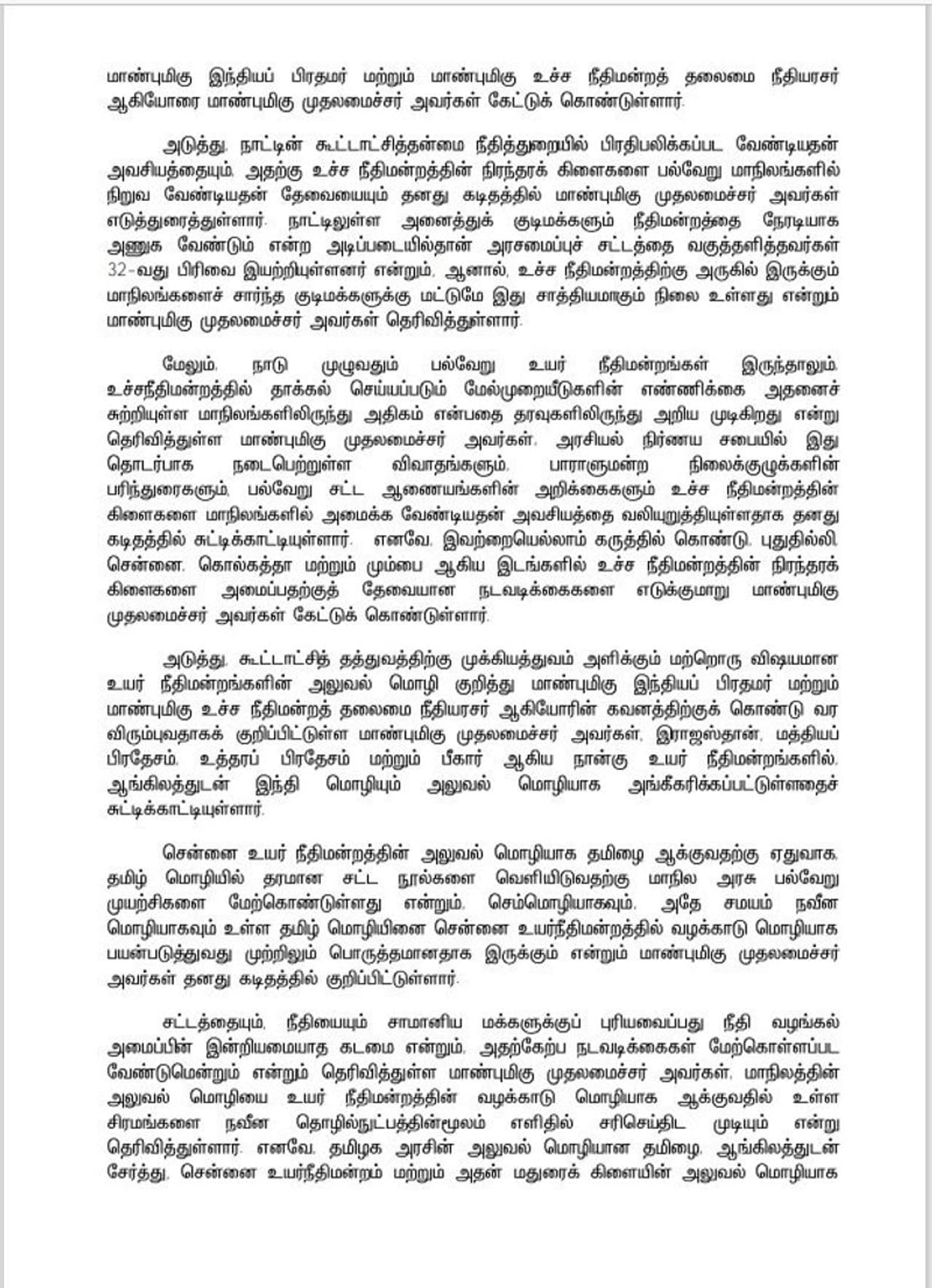 இராஜஸ்தான், மத்தியப்பிரதேசம், உத்தரப் பிரதேசம் மற்றும் பீகார் ஆகிய நான்கு உயர் நீதிமன்றங்களில், ஆங்கிலத்துடன் இந்தி மொழியும் அலுவல் மொழியாக அங்கீகரிக்கப்பட்டுள்ளது. எனவே சென்னை உயர் நீதிமன்றத்தின் அலுவல் மொழியாக தமிழை ஆக்குவதற்கு ஏதுவாக, தமிழ் மொழியில் தரமான சட்ட நூல்களை வெளியிடுவதற்கு மாநில அரசு பல்வேறு முயற்சிகளை மேற்கொண்டுள்ளது. தமிழக அரசின் அலுவல் மொழியான தமிழை, ஆங்கிலத்துடன் சேர்த்து, சென்னை உயர்நீதிமன்றம் மற்றும் அதன் மதுரைக் கிளையின் அலுவல் மொழியாக அறிவிக்க நடவடிக்கை எடுக்க வேண்டும் என்று தனது கடித்தத்தில் குறிப்பிட்டுள்ளார்.