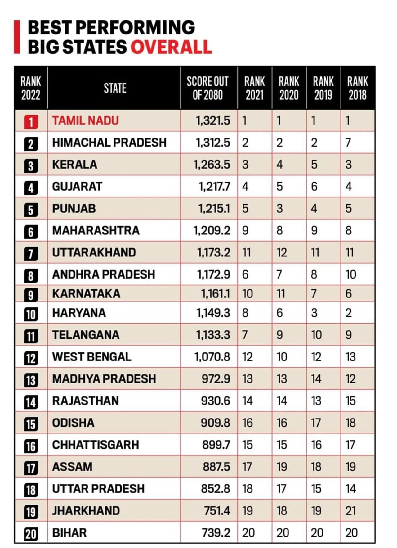 இந்த பட்டியலில் 1.321.5 புள்ளிகளுடன் தமிழகம் முதலிடத்தில் உள்ளது. 1.312.5 புள்ளிகளுடன் இமாச்சல பிரதேசம் 2வது இடத்திலும், 1.263 புள்ளிகளுடன் கேரளா 3வதுது இடத்திலும், பாஜக ஆளும் மாநிலமாக குஜராத் 1.217.7 புள்ளிகளுடன் 4வது இடத்திலும் உள்ளது. இந்த பட்டியலில் பாஜக ஆளும் குஜராத் நான்காவது இடத்திலும், கர்நாடகா எட்டாவது இடத்திலும், மத்திய பிரதேசம் 13-வது இடத்திலும், உத்தரப்பிரதேசம் 18வது இடத்திலும் உள்ளது.