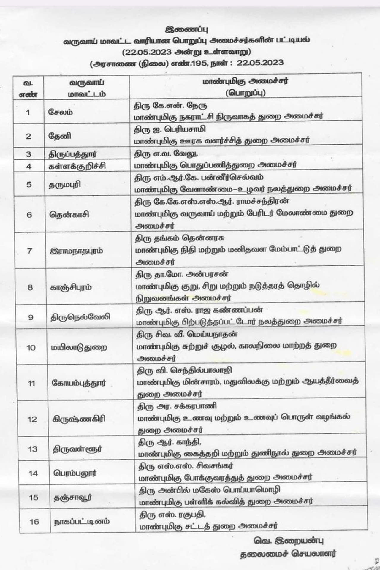 இதே போல சேலத்திற்கு கேஎன் நேரு, தேனிக்கு ஐ.பெரியசாமி, திருப்பத்தூர் மற்றும் கள்ளக்குறிச்சிக்கு எ.வ வேலு, தருமபுரிக்கு எம்ஏர்கே.பன்னீர் செல்வம், தென்காசிக்கு கேஎஸ்எஸ்ஆர் ராமசந்திரன், ராமநாதபுரம் தங்கம் தென்னரசு, காஞ்சிபுரம் தா.மோ அன்பரசன், திருநெல்வேலி ராஜ கண்ணப்பன், கோவைக்கு செந்தில் பாலாஜி, பெரம்பலூர் சிவசங்கர், தஞ்சாவூர் அன்பில் மகேஷ், உள்ளிட்ட அமைச்சர்கள் பொறுப்பு அமைச்சராக நியமிக்கப்பட்டுள்ளனர்.