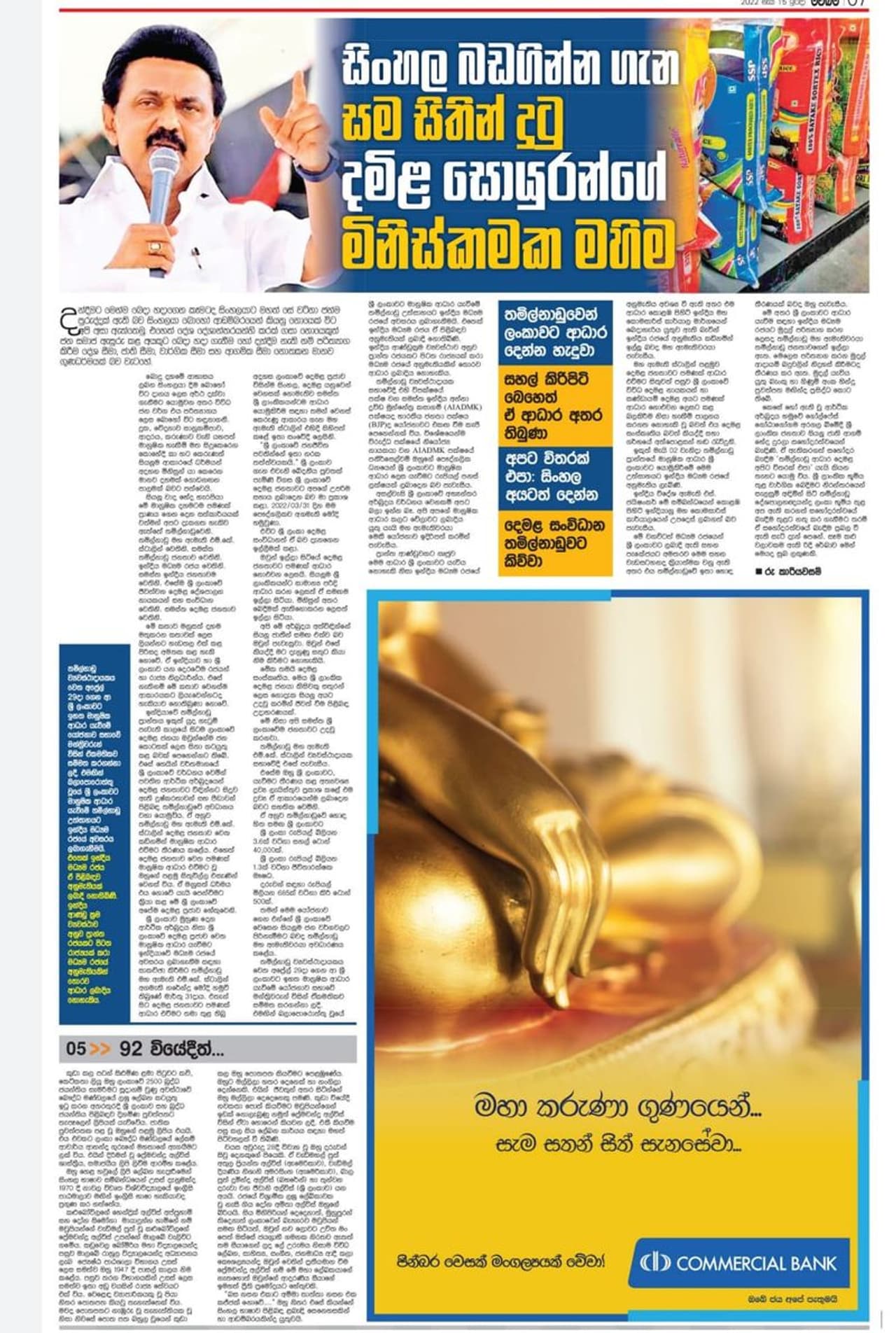 சிங்களர் பசி கண்டு மனிதநேயத்துடன் உதவும் தமிழகமே.. முதல்வர் ஸ்டாலின் அவர்களே உங்களுக்கு நன்றி என சிங்கள நாளேடு மௌபிம நெகிழ்ந்து பாராட்டிப் புகழாரம் சூட்டியுள்ளது.