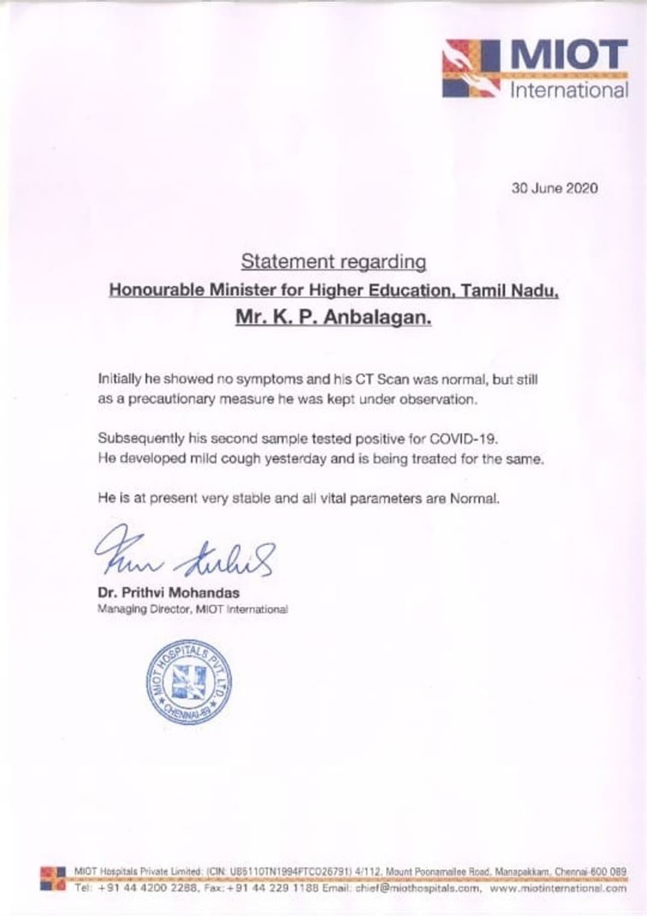 இந்நிலையில். அமைச்சர் கே.பி.அன்பழகனுக்கு 2வது முறையாக கொரோனா பரிசோதனை செய்யப்பட்டதில் தொற்று உறுதி செய்யப்பட்டுள்ளதாக தனியார் மருத்துவமனை தெரிவித்துள்ளது. மேலும் அவரது உடல் நிலை சீராக உள்ளதாகவும் தொடர்ந்து அவர் கண்காணிக்கப்பட்டு வருவதாகவும் தனியார் மருத்துவமனை சார்பில் அறிக்கை வெளியிடப்பட்டுள்ளது.