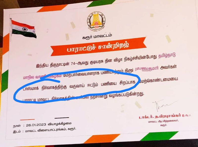 மது விற்பனையில் வருவாய் ஈட்டியதற்காக கரூர் மாவட்ட நிர்வாகம் பாராட்டு சான்றிதழ் வழங்கப்பட்ட சம்பவம் பரபரப்பை ஏற்படுத்தி உள்ளது.
