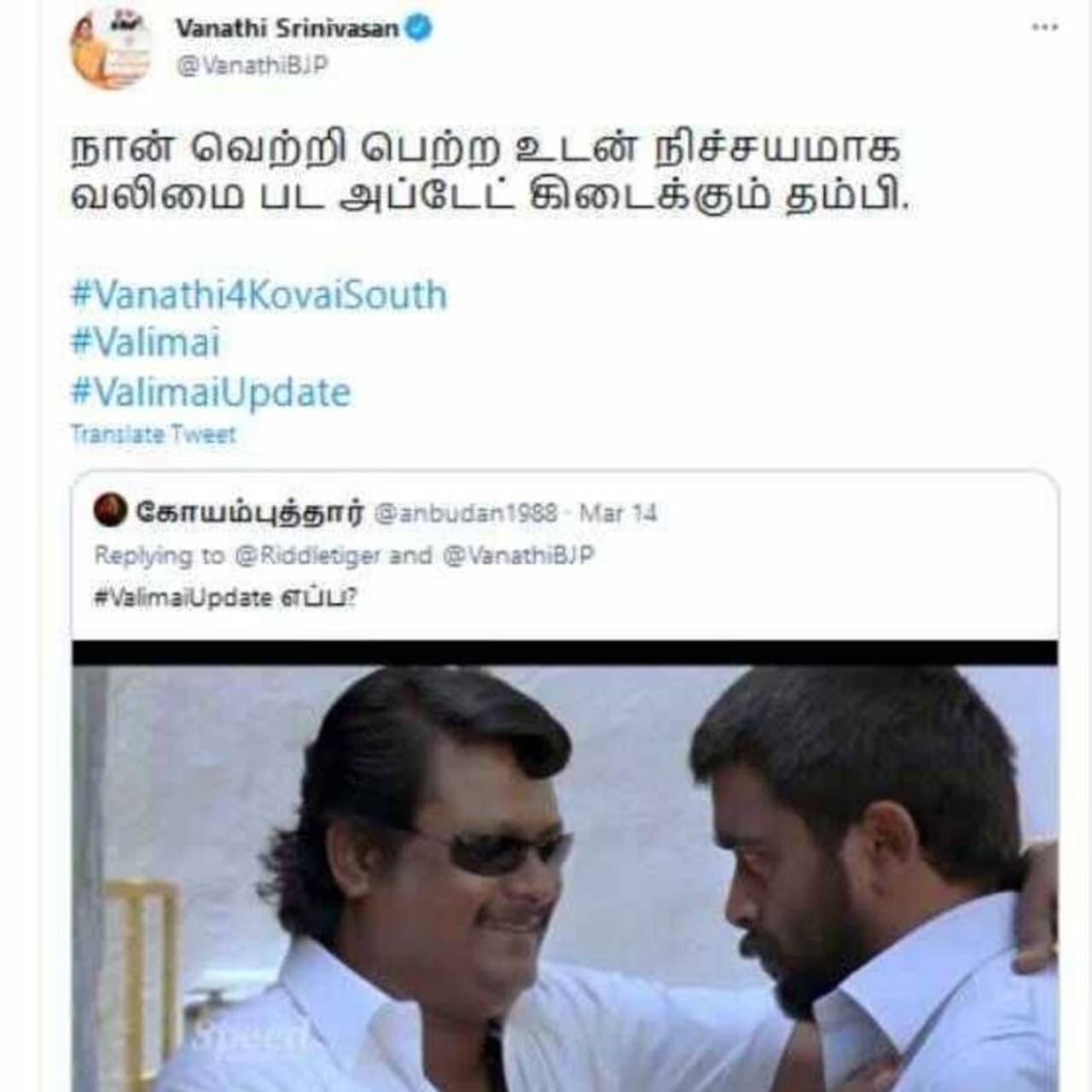 தேர்தல் பிரசாரத்தின் சமயத்தில் கடந்த மார்ச் மாதம் இளைஞர் ஒருவர், 'வலிமை அப்டேட் எப்ப?' என ட்விட்டரில் வானதி சீனிவாசனை டெக் செய்து கேட்டிருந்தார். ட்விட்டரில் ஆக்டிவாக இருக்கும் வானதி சீனிவாசன் அதற்குப் பதிலும் அளித்திருந்தார். அதாவது "நான் வெற்றி பெற்ற உடன் நிச்சயமாக 'வலிமை' பட அப்டேட் கிடைக்கும் தம்பி" என ட்வீட் செய்திருந்தார்.