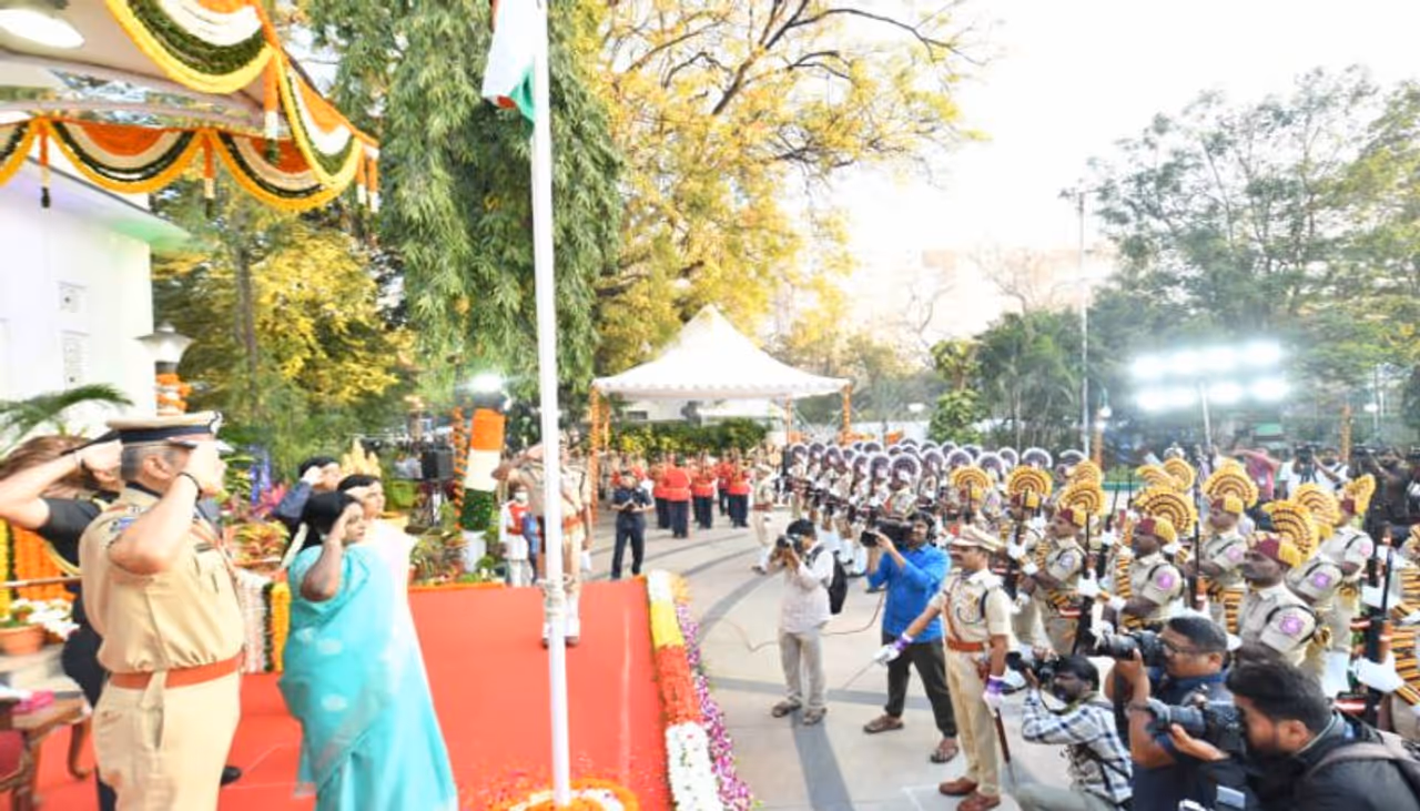74-வது குடியரசு தினம் நாடு முழுவதும் சிறப்பாக கொண்டாடப்பட்டு வருகிறது. மத்திய, மாநில அரசுகள் பல்வேறு நிகழ்ச்சிகளுக்கு ஏற்பாடு செய்திருக்கின்றன. மாநிலங்களில் குடியரசு தின விழாவில் ஆளுநர்களும், சுதந்திர தின விழாவில் முதல்வரும் கொடியேற்றுவது வழக்கம். இந்நிலையில் தெலங்கானா தலைநகர் ஐதராபாத்தில் உள்ள ஆளுநர் மாளிகையில், குடியரசு தின விழா கொண்டாட்டத்திற்கு ஏற்பாடு செய்யப்பட்டது. மாநில ஆளுநர் தமிழிசை சவுந்தரராஜன் தேசியக்கொடி ஏற்றி வைத்து மரியாதை செலுத்தினார்.