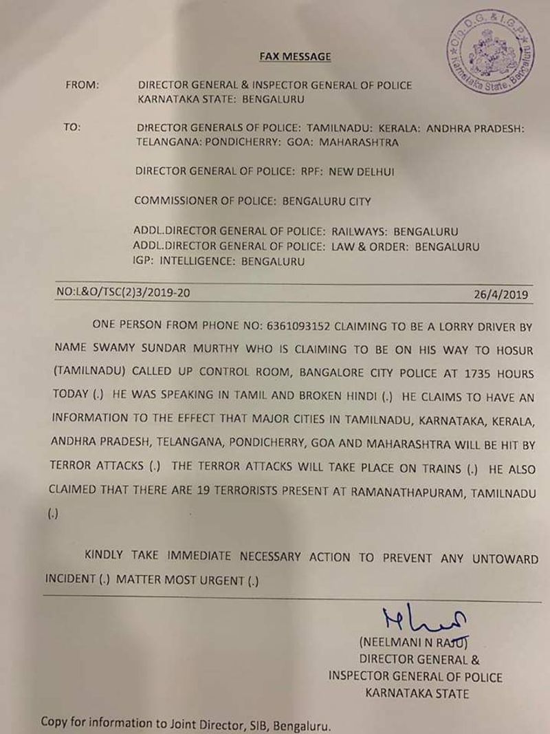 இந்த தகவலையொட்டி, பெங்களூரு போலீசார் தமிழ்நாடு உள்ளிட்ட மாநிலங்களுக்கு எச்சரிக்கை செய்தி அனுப்பியுள்ளனர். இந்த தகவலை முக்கியமான தகவலாக கருதி, உரிய முன்னெச்சரிக்கை நடவடிக்கை எடுக்க வேண்டும் என்றும் பெங்களூரு போலீசார் கேட்டுக்கொண்டனர்.