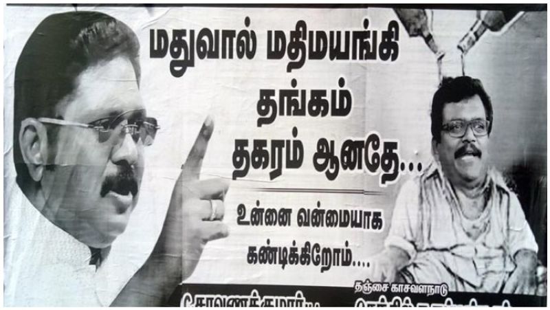 தினகரன் ஒரு விரல் நீட்டி எச்சரிப்பது போல் இருக்கும் அந்தப் போஸ்டரில், தங்க தமிழ்ச்செல்வன் தலையில் மதுபாட்டில்கள் இரண்டைக் கவிழ்த்து, ‘மதுவால் மதிமயங்கி தங்கம் தகரம் ஆனதே.. உன்னை வன்மையாகக் கண்டிக்கிறோம்..’ என்ற வாசகங்களை இடம்பெறச் செய்திருக்கின்றனர். மதுரை உட்பட, பல ஊர்களிலும் இந்தப் போஸ்டர்கள் ஒட்டப்பட்டிருக்கின்றன.