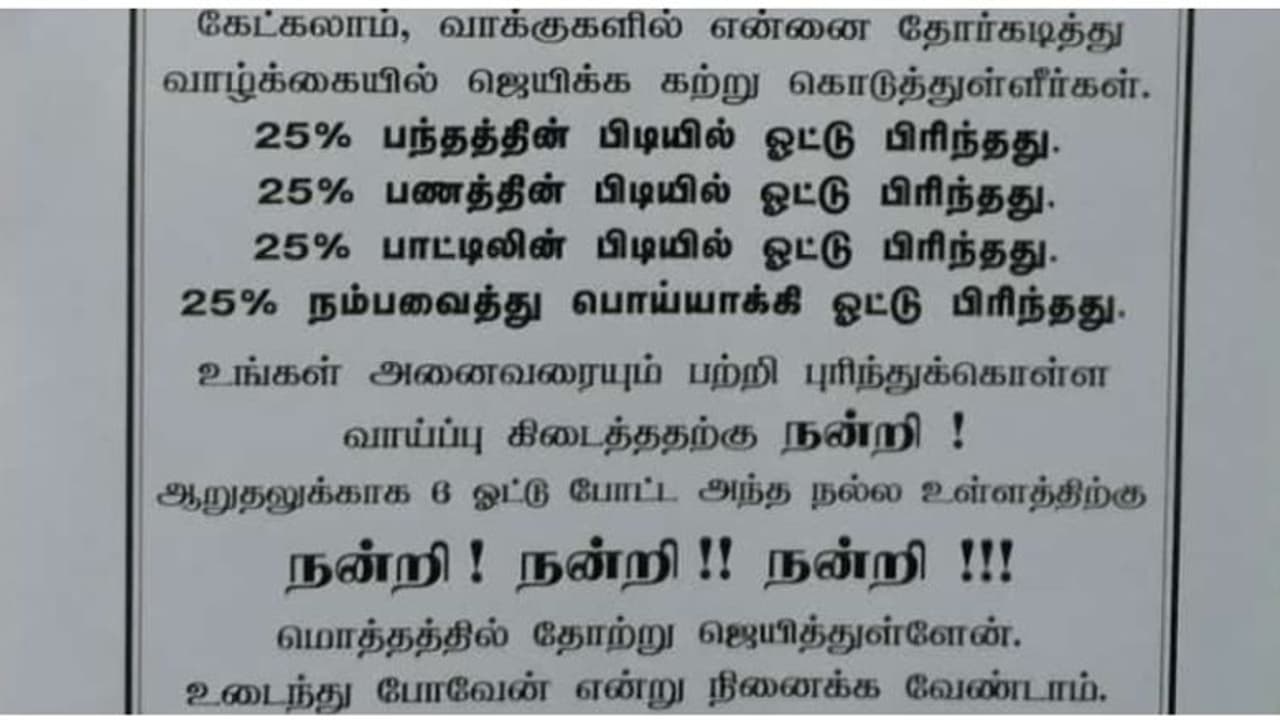 காஞ்சிபுரம் மாவட்டம் பென்னலூர் ஊராட்சியில் 9-ஆவது வார்டு தேர்தலில் போட்டியிட்ட ஓ.முத்து என்பவர் 6 ஓட்டுகள் மட்டுமே பெற்று படுதோல்வியடைந்தார். வழக்கமாக தேர்தலில் வெற்றி பெற்றவர்கள் வாக்காளர்களுக்கு நன்றி அறிவிப்பு செய்து போஸ்டர்கள் ஒட்டுவார்கள். ஆனால், தேர்தலில் படுதோல்வியடைந்த வேட்பாளர் ஒ.முத்து நன்றி தெரிவித்து துண்டு பிரசுரம் வெளியிட்டுள்ளார். அதில் அவர் தெரிவித்துள்ள பாயிண்டுகள்தான் சுவாரசியமானவை.