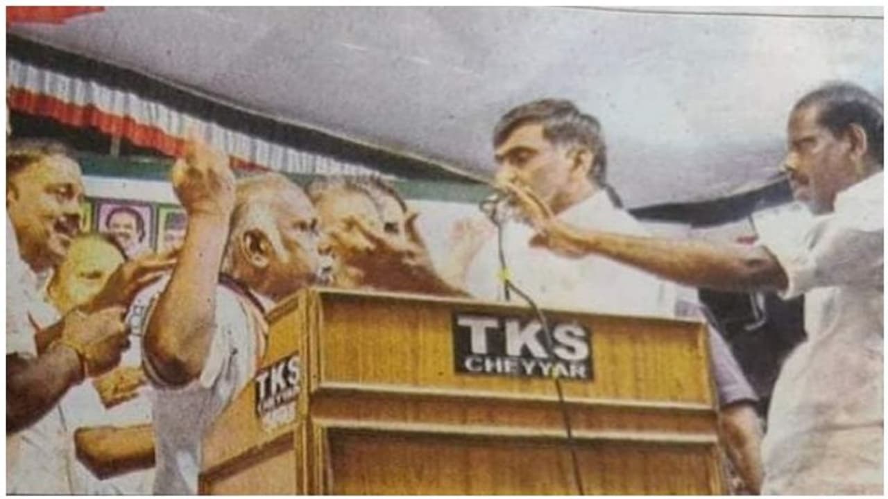 உடனே மேடையில் இருந்த நிர்வாகிகள் சுதாரித்து ஜனார்த்தனனை தடுத்தனர். பின்னர் மைக்கில் அவர் பின்னர் மைக்கில் அவர் பெயரை சொல்லி பன்னீர்செல்வத்துக்கு சால்வை அணிவிக்க ஏற்பாடு செய்தனர். சால்வையை பெற்றுக் கொண்ட ஓ.பி.எஸ் அதனை ஜனார்த்தனுக்கே போர்த்தினார். இதையடுத்து அமைச்சர் வீரமணிக்கும் ஜனார்த்தனன் சால்வை அணிவிக்க முயன்றார். ஆனால் வீரமணியோ வேண்டாம் என்று தடுத்து விட்டார்.