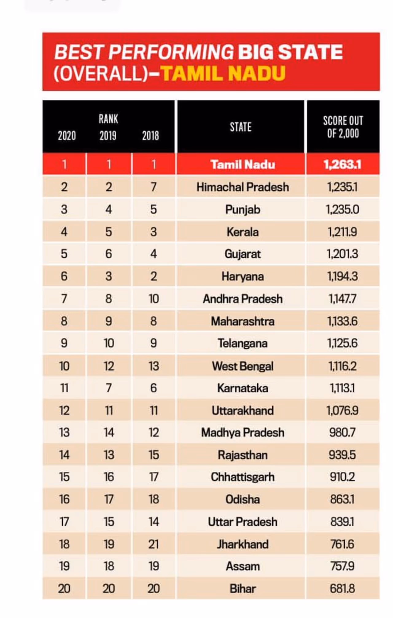 தமிழகத்திற்கு அடுத்தபடியாக ஹிமாச்சல பிரதேச மாநிலம் இரண்டாம் இடத்திலும், பஞ்சாப் மாநிலம் மூன்றாம் இடத்தையும் பிடித்துள்ளது. நீர் மேலாண்மை, சுகாதாரத்துறை, உள்ளாட்சித்துறை உள்ளிட்ட அனைத்து துறைகளிலும் சிறந்து விளங்கும் மாநிலமாக தமிழகம் தேர்ந்தெடுக்கப்பட்டுள்ளதற்கான கடிதத்தை இந்தியா டுடே இதழ் நிர்வாகம் தமிழக முதல்வருக்கு கடிதமாக தெரிவித்துள்ளது.