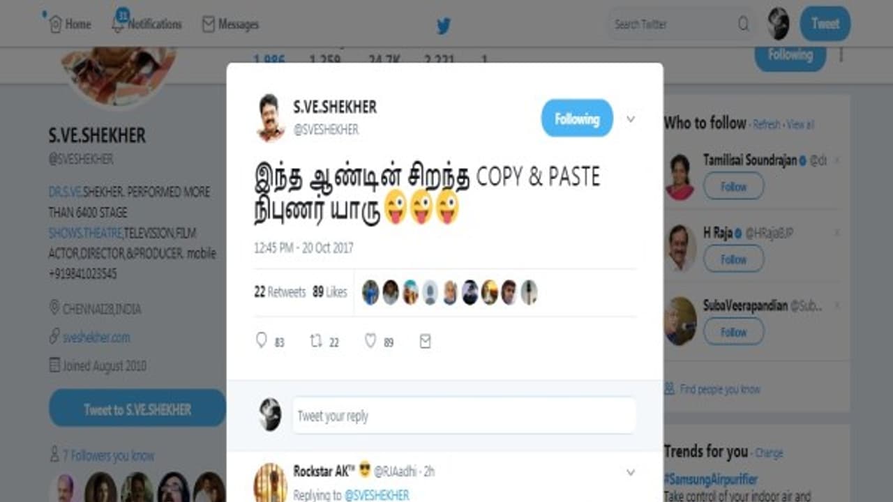 அதாவது, இந்த ஆண்டின் சிறந்த COPY & PASTE நிபுணர் யாரு என்று நடிகர் எஸ்.வி சேகர் தனது டுவிட்டர் பக்கத்தில் மெர்சல் படத்தை கலாய்ப்பது போன்று கேள்வி எழுப்பியிருந்தார்.