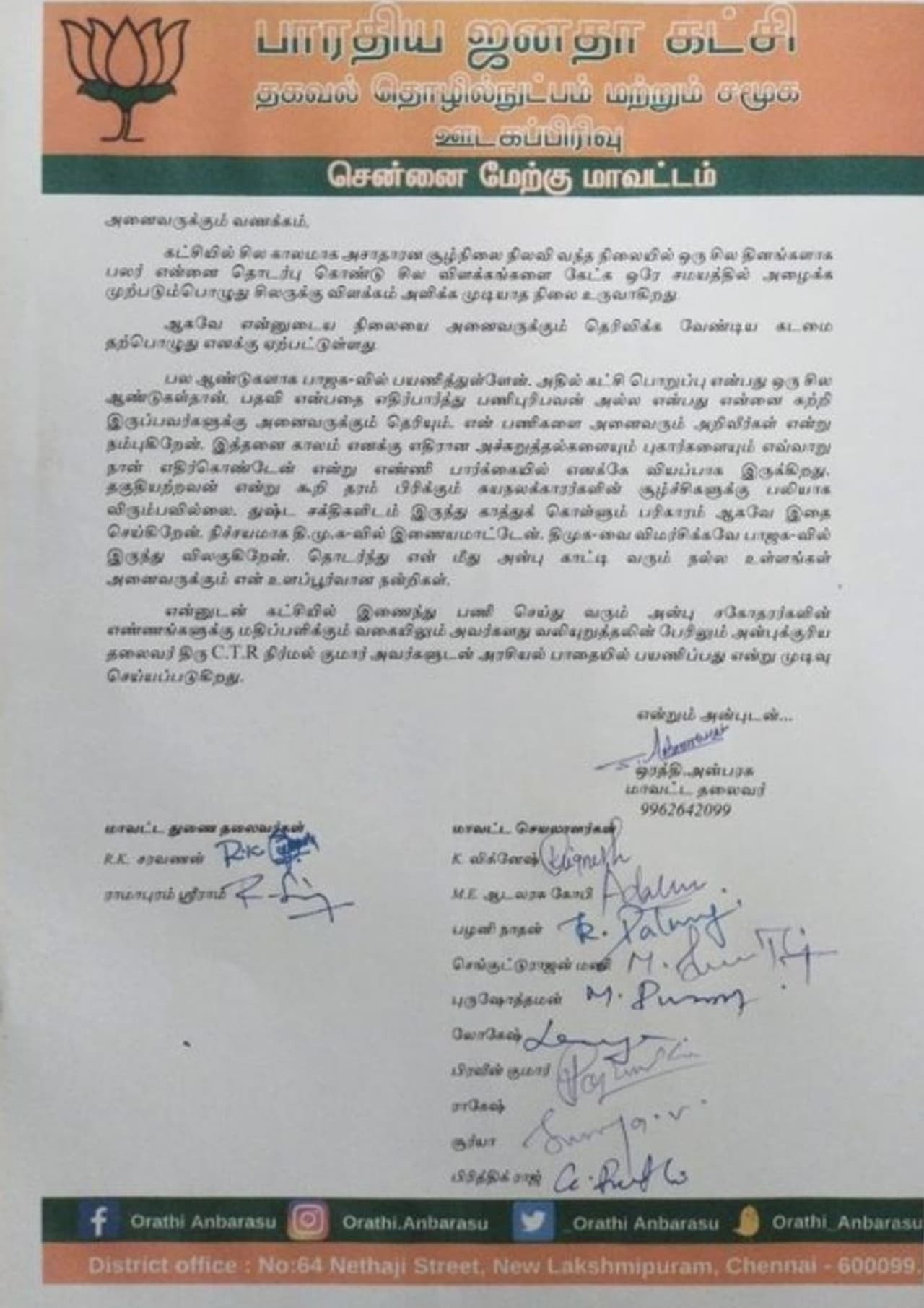 இதனையடுத்து சமூக வலை தளத்தில் அந்த அறிக்கையை பரப்பி உள்ளனர். தற்போதும் நான் பாஜகவில் தான் உள்ளேன். அண்ணாமலை கூட பயணிக்கவே விரும்புவதாக தெரிவித்துள்ளார். இதேபோல 10 மாவட்ட செயலாளர்கள் விலகவில்லையெனவும் பாஜக ஆதரவாளர்கள் தெரிவித்துள்ளனர்.