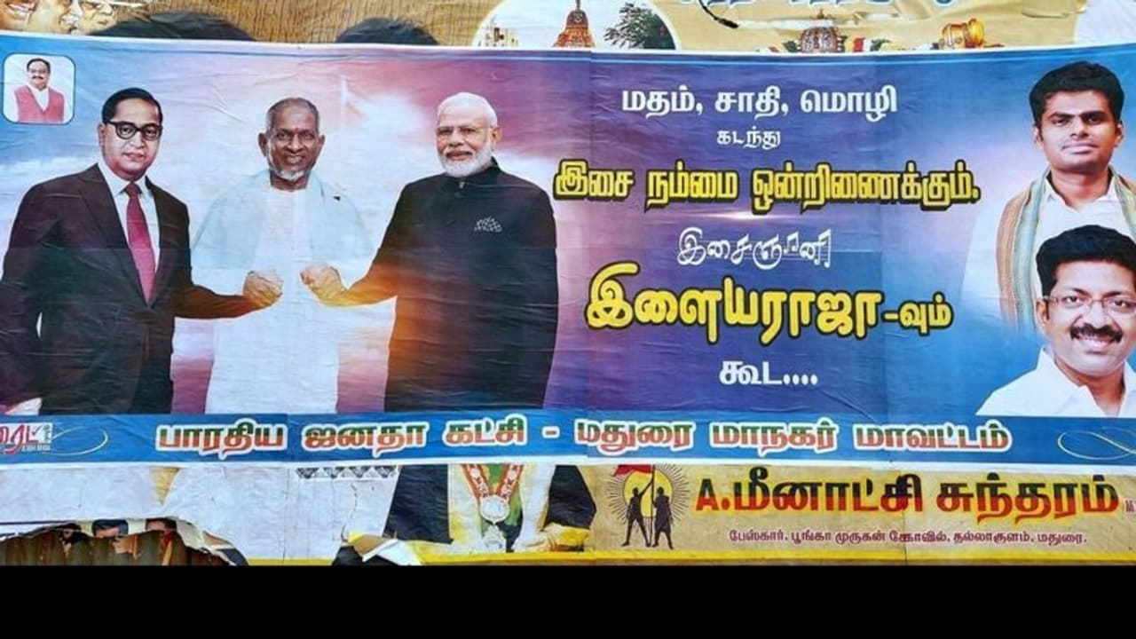 இந்நிலையில் மதுரை நகரில் பல இடங்களில் மோடி மற்றும் அம்பேத்கர் படத்திற்கு நடுவே இளையராஜா நின்று இரு தலைவர்களின் கைகளை இணைப்பது போல போட்டோஷாப் செய்து போஸ்டர்கள் ஒட்டப்பட்டுள்ளது. மேலும் போஸ்டரில் ஜாதி, மதம், மொழி கடந்து இசை நம்மை ஒன்றிணைக்கும் இசை ஞானி இளையராஜாவும் கூட என்ற வாசகத்துடன் மாநகர பாஜக கட்சியினர் போஸ்டர்கள் ஒட்டியுள்ளனர். இது பரபரப்பை ஏற்படுத்தி உள்ளது.