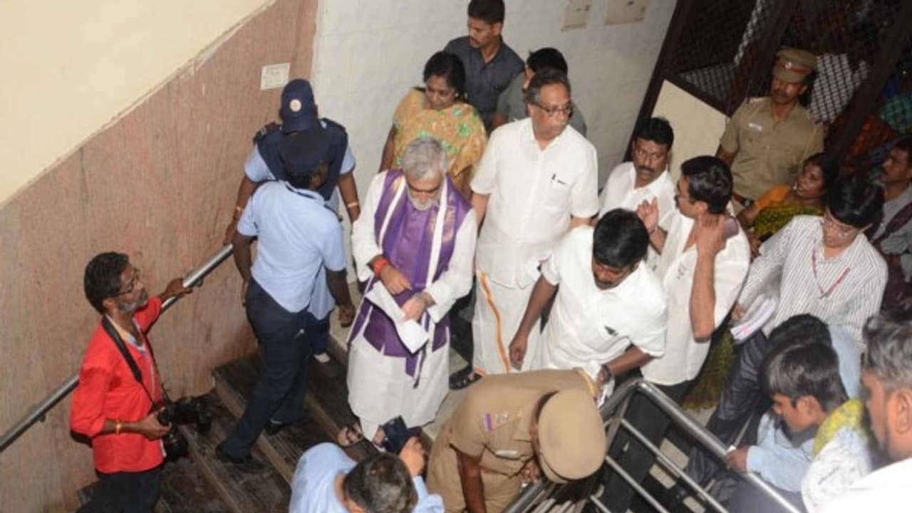பின்னர், முதல் தளம் இறங்கி செல்ல முயன்ற போது, படிக்கட்டின் கீழ் அமைந்துள்ள கதவு பூட்டப்பட்டிருந்தது. பூட்டை திறப்பதற்காக மருத்துவர்களும் ஊழியர்களும் முயன்றனர். ஆனால், பூட்டை திறக்க முடியவில்லை என்று கூறப்படுகிறது. இதனால் விஜயபாஸ்கர், ராதாகிருஷ்ணன் மற்றும் மருத்துவர்கள் தர்ம சங்கடத்துக்கு ஆளானார்கள்.