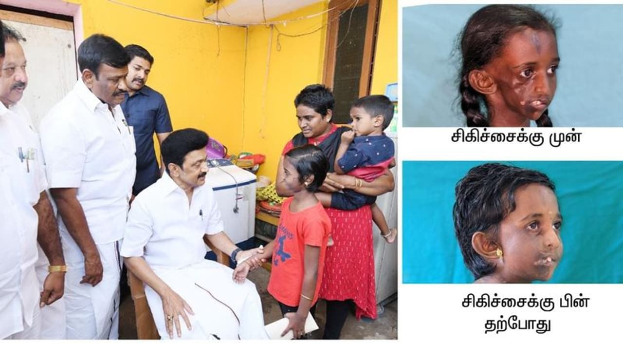 முக சிதைவு நோயால் பாதிக்கப்பட்ட சிறுமி டானியாவிற்கு இரண்டு முறை அறுவை சிகிச்சை செய்யப்பட்டு வீட்டிற்கு திரும்பிய சிறுமியை முதலமைச்சர் மு.க.ஸ்டாலின் நேரில் சென்று நலம் விசாரித்தார்.
