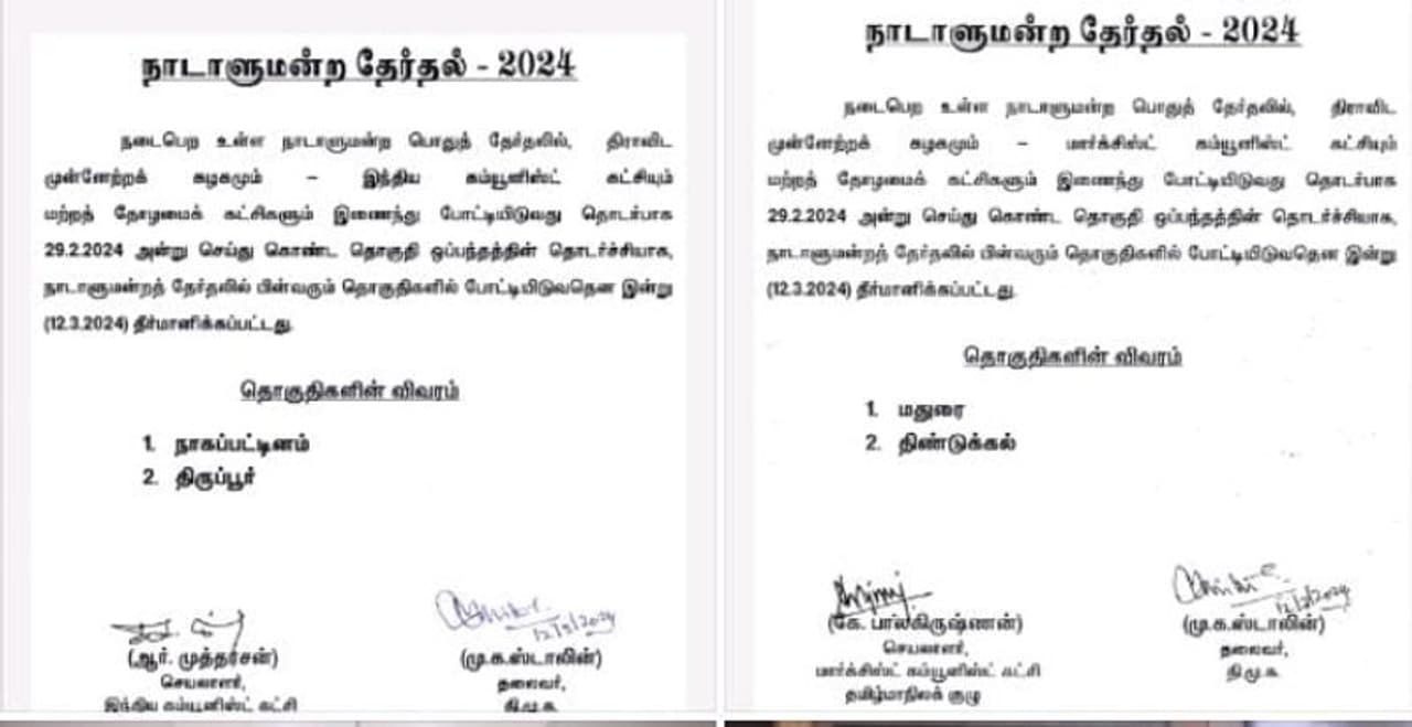 நாடாளுமன்ற தேர்தலில் திமுக கூட்டணியில் போட்டியிடும் மார்க்சிஸ்ட் கம்யூனிஸ்ட் மற்றும் இந்திய கம்யூனிஸ்ட் கட்சிக்கு இரண்டு தொகுதிகள் ஒதுக்கப்பட்ட நிலையில், தற்போது எந்த, எந்த தொகுதி என்ற அறிவிப்பு வெளியிடப்பட்டுள்ளது.