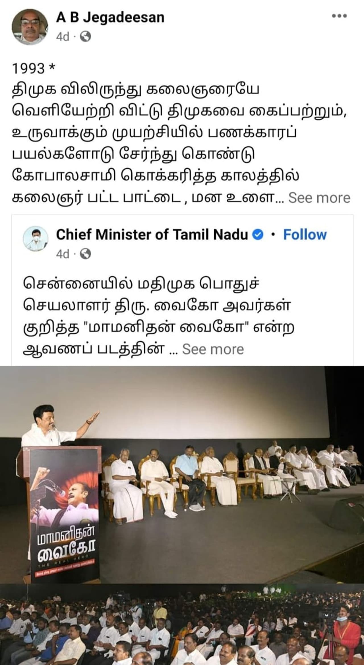 இதே போல மற்றொரு பதிவில், 1993 திமுக விலிருந்து கலைஞரையே வெளியேற்றி விட்டு திமுகவை கைப்பற்றும், உருவாக்கும் முயற்சியில் பணக்காரப் பயல்களோடு சேர்ந்து கொண்டு கோபாலசாமி கொக்கரித்த காலத்தில் கலைஞர் பட்ட பாட்டை , மன உளைச்சலை , உற்ற வேதனையை அருகிருந்து கண்டவர் நாங்கள் ! அந்த நிகழ்வுகள் 30 ஆண்டுகள் ஆகியும் ஆறாத ரணம் எங்களுக்கு ! பேசிய பேச்சுக்கள் , ஏசிய வசவுகள் , சீண்டிய கிண்டல்கள் , செய்த அவமதிப்புக்கள் , ஏகடியங்கள் கணக்கில் அடங்காதவை ! ஆட்சியில் அமர்ந்துள்ளோருக்கு அது மறந்திருக்கலாம் . அவர் தம் அணுகுமுறை வேறு .நாங்கள் ஏற்பதற்கில்லை சுய மரியாதை எமக்கு கொஞ்சம் உண்டு என விமர்சித்துள்ளார்.