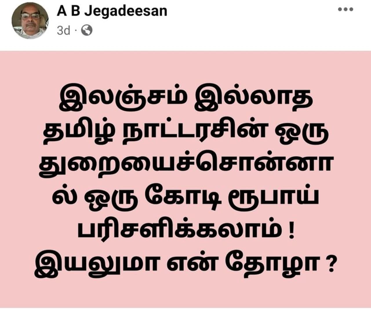 திமுக அரசில் லஞ்சம் இல்லாத துறையை காட்டினால் ஒரு கோடி ரூபாய் பரிசு என முன்னாள் அமைச்சர் சுப்புலட்சுமி ஜெகதீசனின் கணவர் ஜெகதீசன் சமூக வலை தளத்தில் பதிவிட்டிருப்பது பரபரப்பை ஏற்படுத்தியுள்ளது.