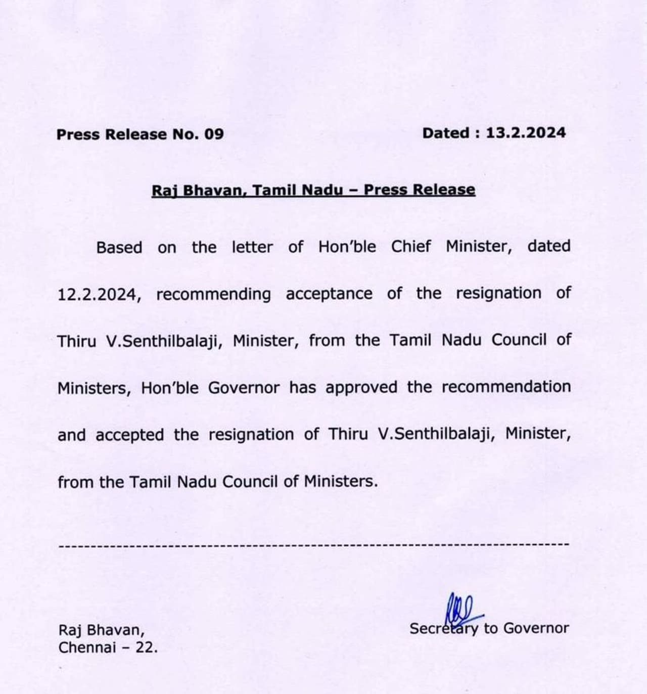இதனையடுத்து செந்தில் பாலாஜி பலமுறை ஜாமின் கேட்டும் நீதிமன்றம் ஜாமின் வழங்காத நிலையில் தொடர்ந்து சிறையில் இருக்க வேண்டிய நிலை ஏற்பட்டது. 230 நாட்களுக்கு மேல் சிறையில் இருக்கும் செந்தில் பாலாஜி நேற்று தனது ராஜினாமா கடிதத்தை தமிழக முதலமைச்சருக்கு அனுப்பிவைத்தார். இந்த ராஜினாமா கடிதத்தை ஆளுநர் மாளிகைக்கு முதலமைச்சர் அனுப்பிவைத்தார். தற்போது செந்தில் பாலாஜியின் ராஜினாமா ஏற்றுக்கொள்ளப்பட்டதாக ஆளுநர் மாளிகை அதிகாரப்பூர்வமாக அறிவித்துள்ளது.