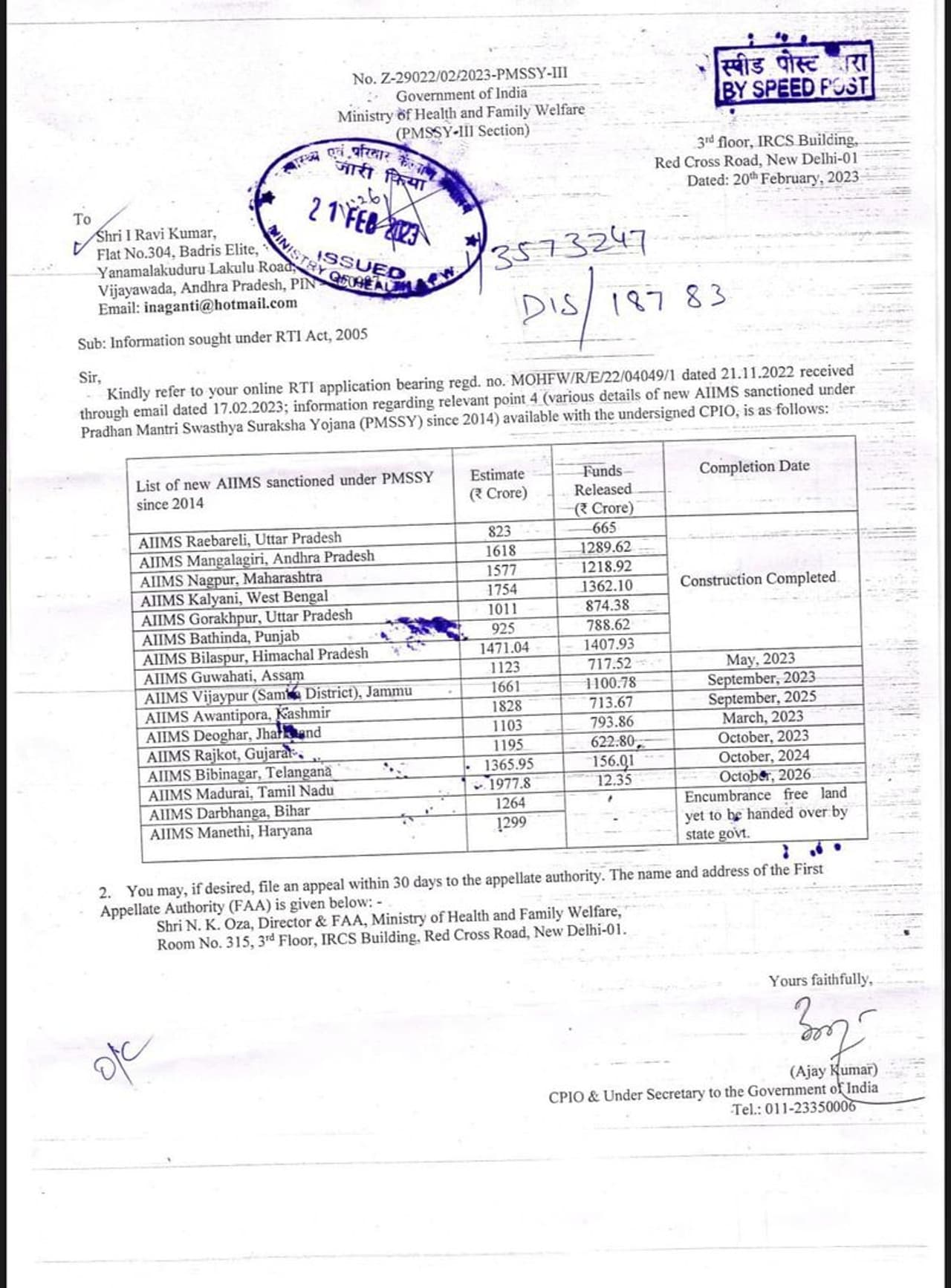 அஸ்ஸாம் மற்றும் ஜம்முவில் இந்த ஆண்டில் நிறைவடையும் என கூறப்பட்டுள்ளது. அதில் குஜராத் மாநிலத்தில் எய்ம்ஸ் மருத்துவமனை கட்ட 1195 கோடி மதிப்பீடு செய்யப்பட்ட நிலையில் 622 கோடி ரூபாய் ஒதுக்கப்பட்டுள்ளதாக தெரிவிக்கப்பட்டுள்ளது. தெலுங்கானாவில் 1365 கோடி மதிப்பீடு செய்யப்பட்ட நிலையில், 156 கோடி ரூபாய் ஒதுக்கப்பட்டுள்ளது.