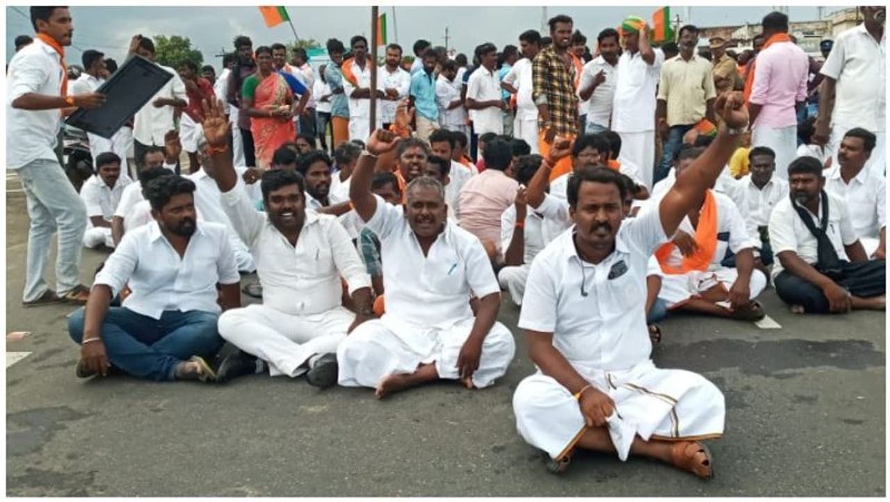 இதனால், ஆத்திரமடைந்த பாஜக,.வினர் ஊராட்சி ஒன்றிய அலுவலக கதவை இழுத்துப் பூட்டினர். இதனை தொடர்ந்து, பாஜகவினர் மதுரை- ராமேஸ்வரம் தேசிய நெடுஞ்சாலையில் பஸ் மறியல் போராட்டத்தில் ஈடுபட்டனர். இதனால் அங்கு அரை மணி நேரத்திற்கும் மேலாக போக்குவரத்து பாதிக்கப்பட்டது. சாலையின் இரு பக்கங்களிலும் சுமார் 500க்கும் மேற்பட்ட வாகனங்கள் அணிவகுத்து நின்றன. பஸ் மறியலில் ஈடுபட்டவர்களிடம் பரமக்குடி டி.எஸ்.பி வேல்முருகன், சத்திரக்குடி இன்ஸ்பெக்டர் அமுதா ஆகியோர் தொடர்ந்து பேச்சுவார்த்தையில் ஈடுபட்டனர். பஸ் மறியல் போராட்டம் நடைபெற்ற போது பரமக்குடி ஒன்றிய பாஜக தலைவர் லிங்கபாண்டி தீக்குளிக்க பெட்ரோல் ஊற்றியதால் அங்கிருந்த போலீசார் அவரை மீட்டனர்.