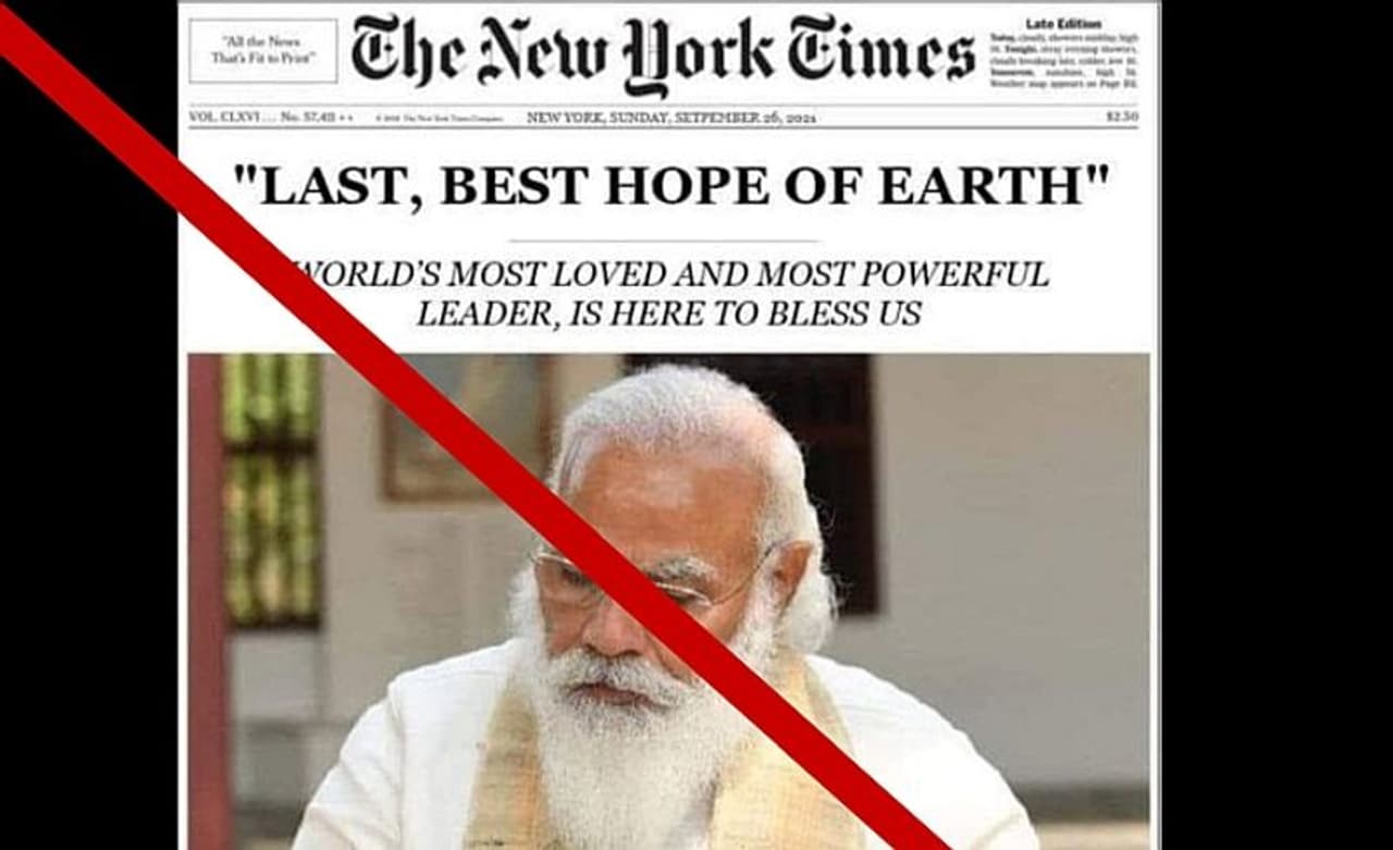 உலகின் கடைசி நம்பிக்கை என்ற தலைப்பிட்டு பிரதமர் மோடியின் அமெரிக்க பயணம் பற்றிய ஒரு செய்தி பிரபல இதழான தி நியூயார்க் டைம்ஸ் செய்தி வெளியயிட்டதாக ஒரு போட்டோ இணையத்தில் பரவியது.