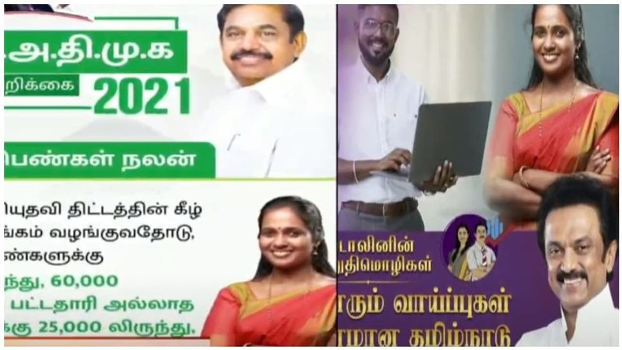 அதிமுக, திமுக கட்சிகளின் தேர்தல் விளம்பரத்தில் ஒரே பெண் இடம் பெற்றிருப்பது தொண்டர்களிடையே குழப்பத்தை ஏற்படுத்தியுள்ளது.