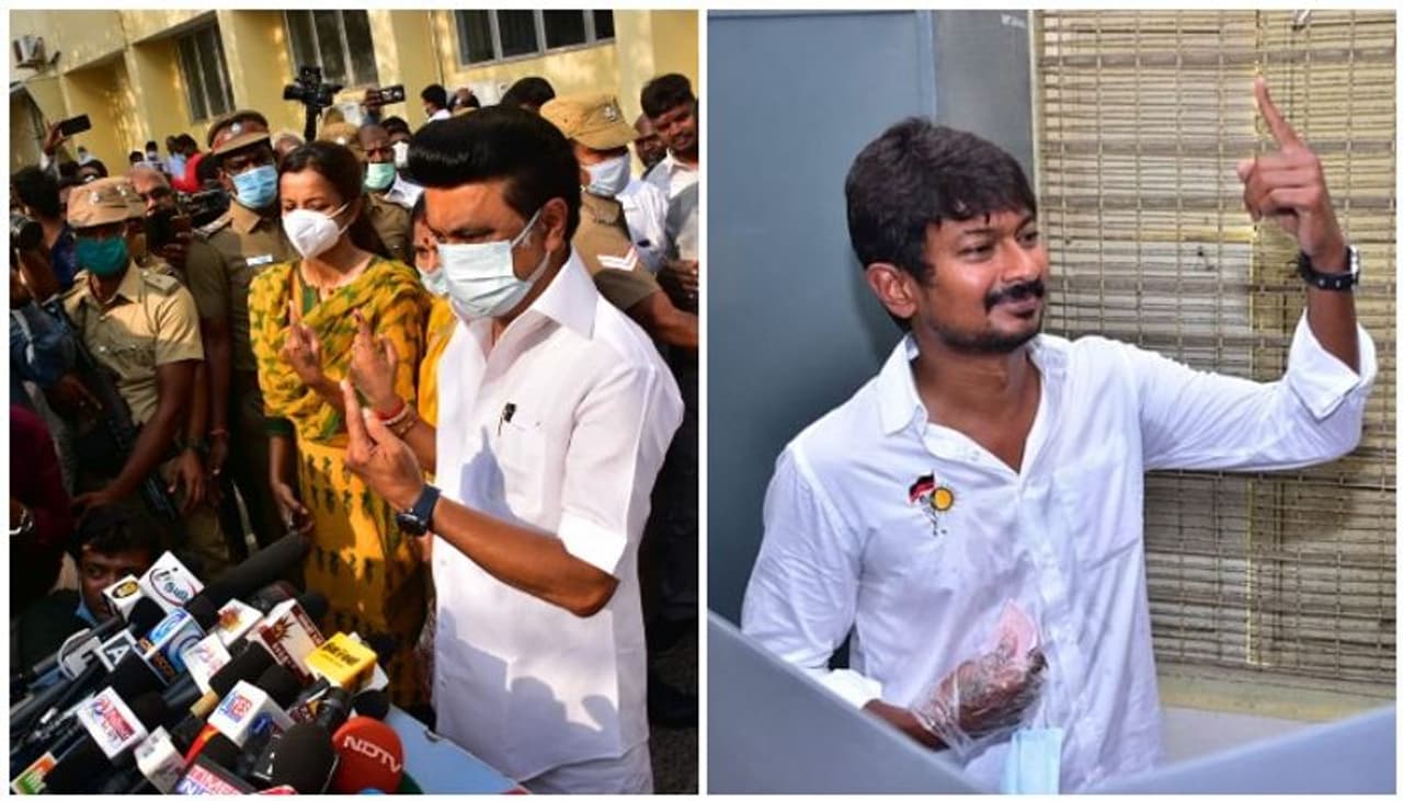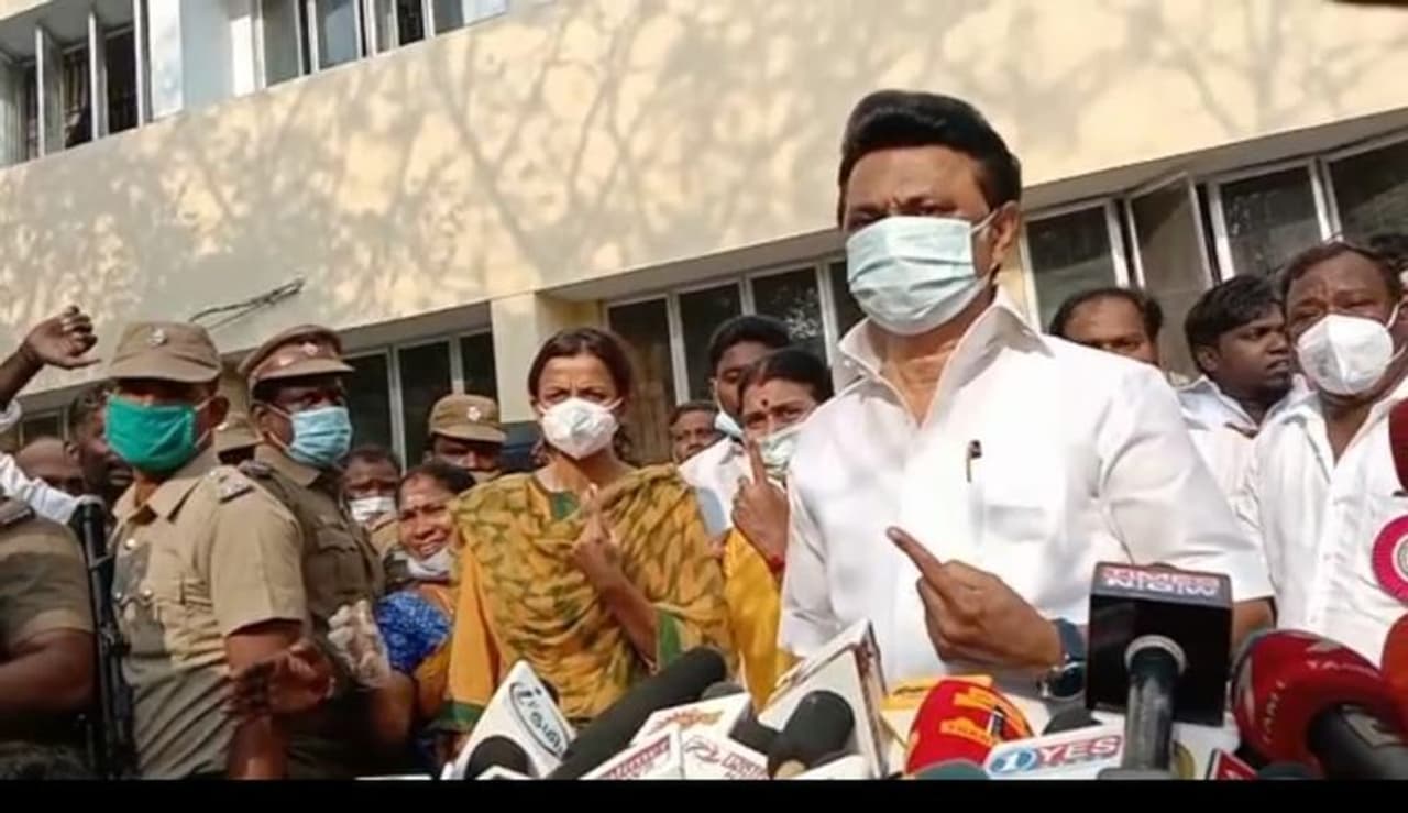 கருணாநிதியின் மறைவிற்கு பிறகு முதன் முறையாக முதலமைச்சர் வேட்பாளராக களமிறங்கியுள்ள மு.க.ஸ்டாலின் முறையாக முகக்கவசம் அணிந்து, சமூக இடைவெளியை பின்பற்றி வரிசையில் நின்று குடும்பத்துடன் வாக்களித்தார். வாக்குப்பதிவிற்கு பின்னர் வெளியே வந்து செய்தியாளர்களைச் சந்தித்த ஸ்டாலின் மனைவி துர்கா, மகன் உதயநிதி மற்றும் மருமகளுடன் தங்களது கையில் உள்ள அடையாள மையை காண்பித்தபடி போட்டோவிற்கு போஸ் கொடுத்தனர்.