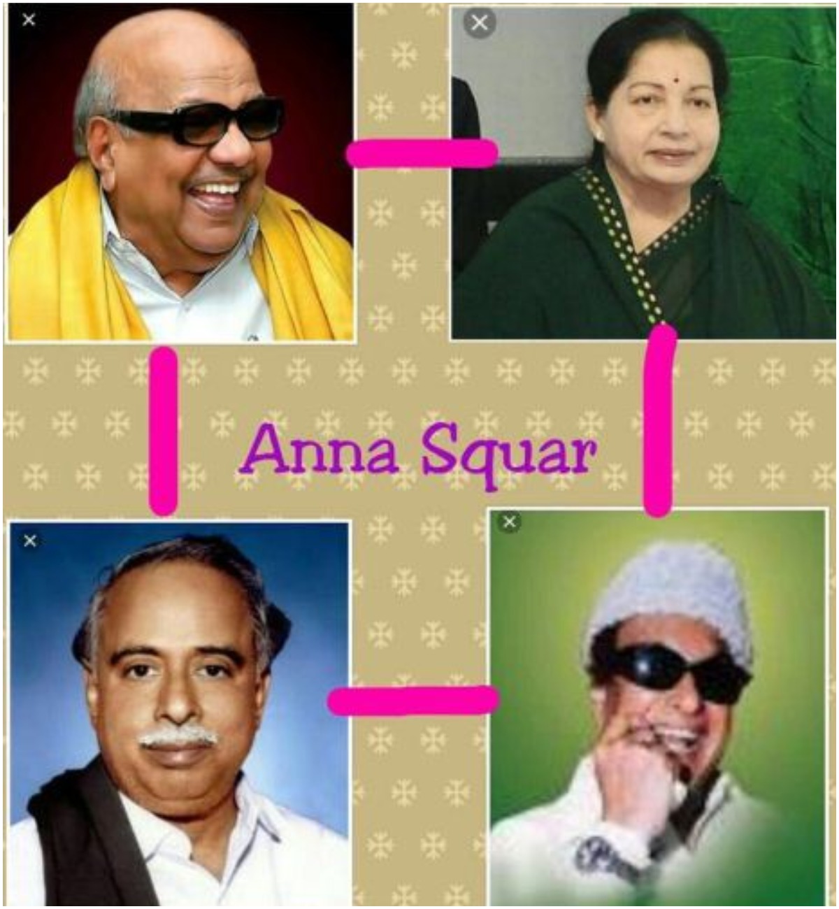 இந்த நான்கு மூலையிலும் தமிழ் நாட்டை ஆண்ட நான்கு முதல்வர்கள் இடம் பெற்று உள்ளனர்.அண்ணா சதுக்கம் என்ற பெயருக்கு ஏற்ப, தற்போது சதுக்கத்தின் நான்கு மூலையும் நிரம்பி விட்டது.