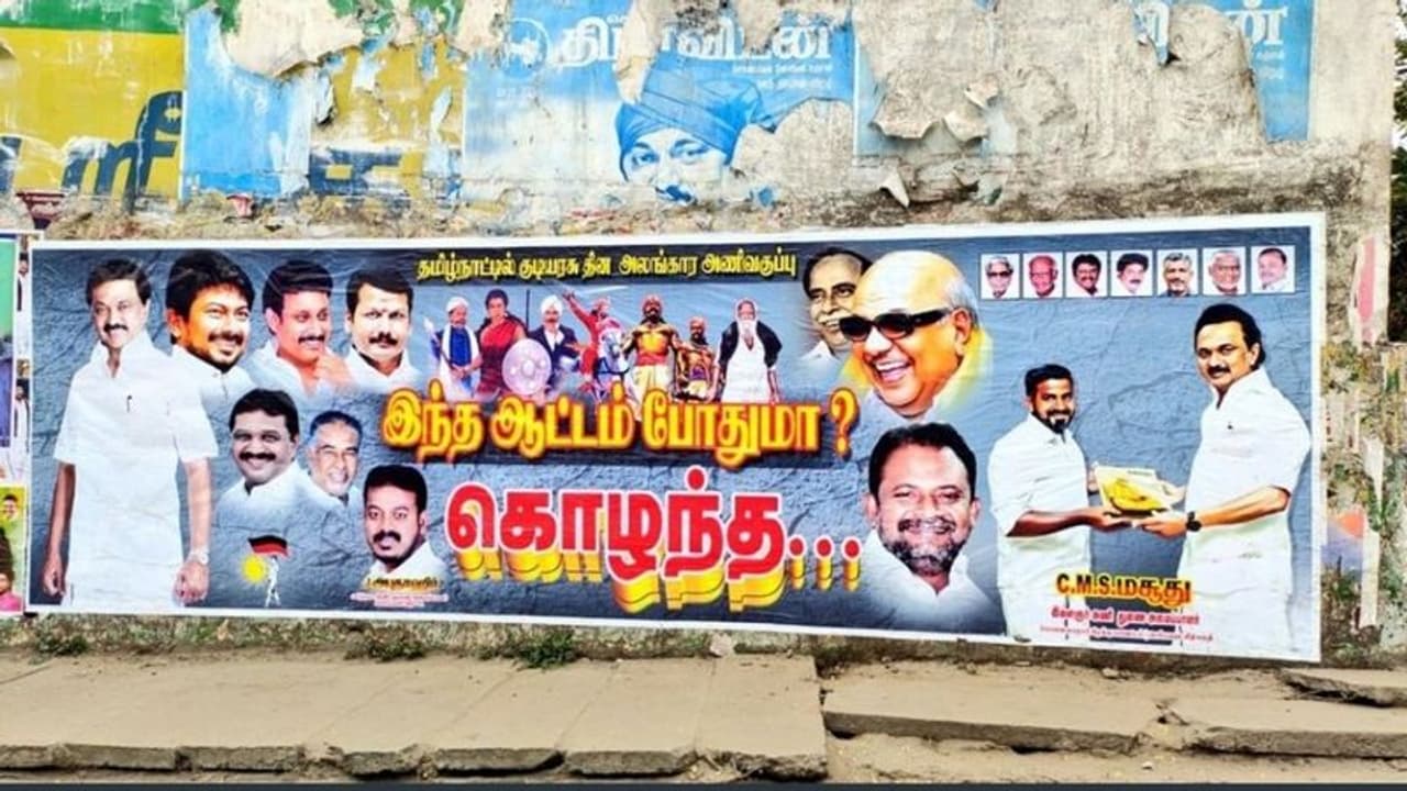 கோவை மாநகர் கிழக்கு மண்டலம் பெரிய கடை வீதி சார்பில் இந்த போஸ்டர்கள் ஒட்டப்பட்டுள்ளன. இந்த போஸ்டரில் சிதம்பரனார், வேலு நாச்சியார், பாரதியார், மருது சகோதரர்கள், பெரியார் ஆகியோரின் புகைப்படங்களும், அமைச்சர்கள் அன்பில் மகேஷ், செந்தில் பாலாஜி, முதல்வர் முக ஸ்டாலின், சேப்பாக்கம் சட்டமன்ற உறுப்பினர் உதயநிதி ஸ்டாலின் ஆகியோரின் புகைப்படங்கள் இடம்பெற்றுள்ளன.இந்த போஸ்டர் தற்போது சமூக வலைத்தளங்கள் முழுக்க வைரலாகி வருகிறது.