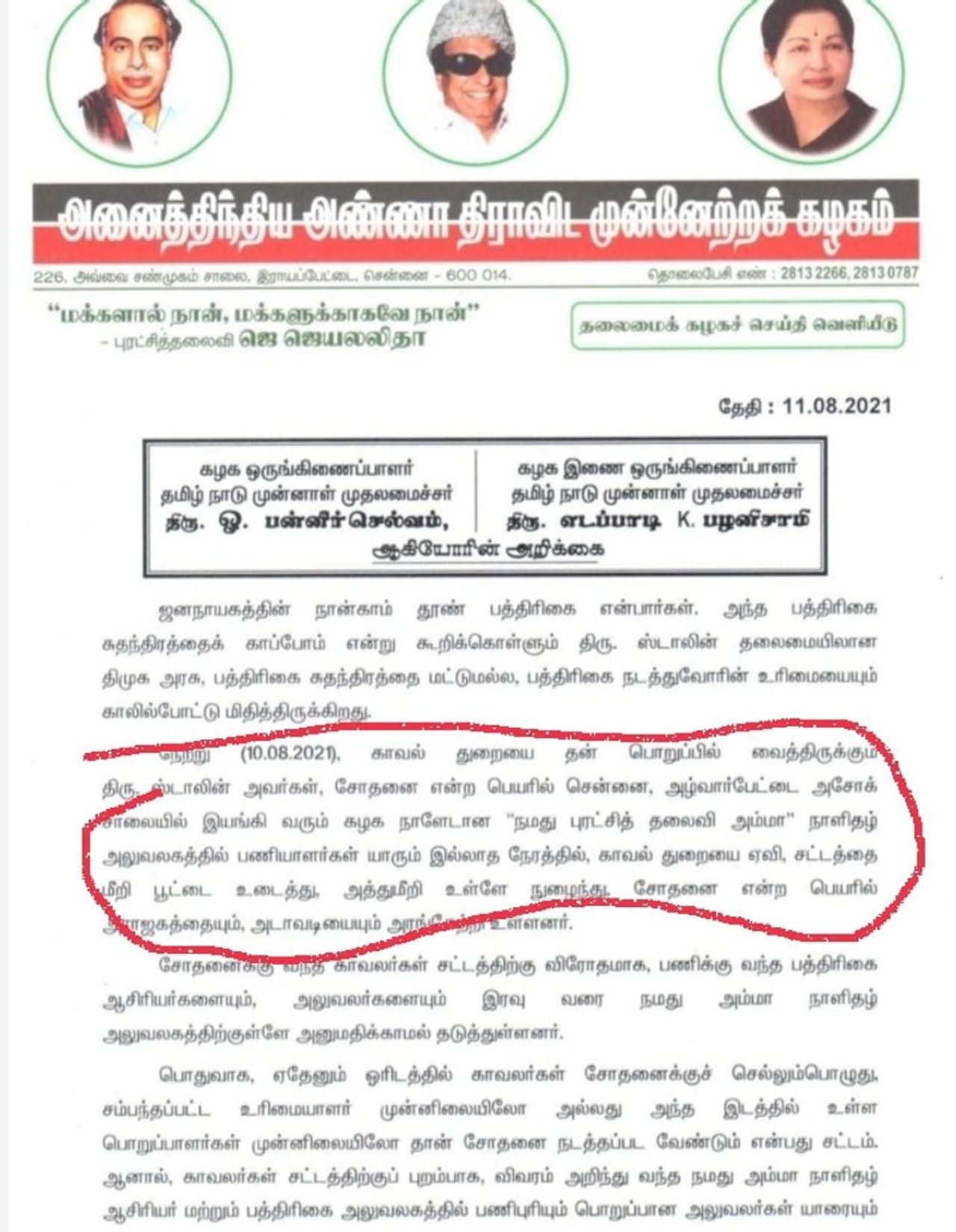 பத்திரிகை சுதந்திரத்திற்கு அச்சுறுத்தலை ஏற்படுத்தும் வகையில், சட்டத்திற்குப் புறம்பாக "நமது அம்மா" நாளிதழ் மீது நடைபெற்ற இந்தத் தாக்குதலுக்கு, காவல்துறையைத் தன் பொறுப்பில் வைத்திருக்கும் ஸ்டாலின் பொறுப்பேற்க வேண்டும். தவறு செய்த காவல்துறையைச் சேர்ந்தவர்கள் மீது தக்க நடவடிக்கை எடுக்க வேண்டும் என்று அதிமுக சார்பாகக் கேட்டுக் கொள்கிறோம். வரும் காலங்களில் பத்திரிகை சுதந்திரத்திற்கு அச்சுறுத்தல் ஏற்படும் இதுபோன்ற செயல்களில் இந்த அரசு ஈடுபடக்கூடாது என்று கேட்டுக் கொள்வதோடு, இச்சம்பவத்தைக் கடுமையாகக் கண்டிக்கின்றோம்"எனத் தெரிவித்துள்ளனர்.