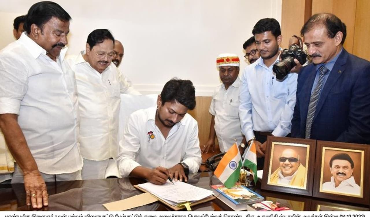 திமுக அரசு பதவியேற்று சுமார் 20 மாதங்கள் முடிவடைந்த நிலையில், அமைச்சரவையில் உதயநிதிக்கு வாய்ப்பு வழங்கப்பட்டுள்ளது. இளைஞர் நலன் மற்றும் விளையாட்டுத்துறை அமைச்சராக உதயநிதி பதவியேற்றுள்ளார். ஆளுநர் மாளிகையில் நடைபெற்ற பதவியேற்பு விழாவிற்கு பின் குழு புகைப்படம் எடுக்கப்பட்டது. அப்போது முன் வரிசையில் உதயநிதிக்கு இடம் ஒதுக்கப்பட்டது. திமுகவில் மூத்த அமைச்சர்களாக இருப்பவர்கள் பின் வரிசையில் இருந்த நிலையில் உதயநிதிக்கு முன் வரிசை ஒதுக்கப்பட்டது விமர்சனத்தை உருவாக்கியது. இதனயைடுத்து தலைமை செயலகத்தில் உதயநிதிக்காக ஒதுக்கப்பட்ட அறையில் பொறுப்பை ஏற்றுக்கொண்ட அவர், 3 முக்கிய கோப்புகளில் கையெழுத்திட்டார்.